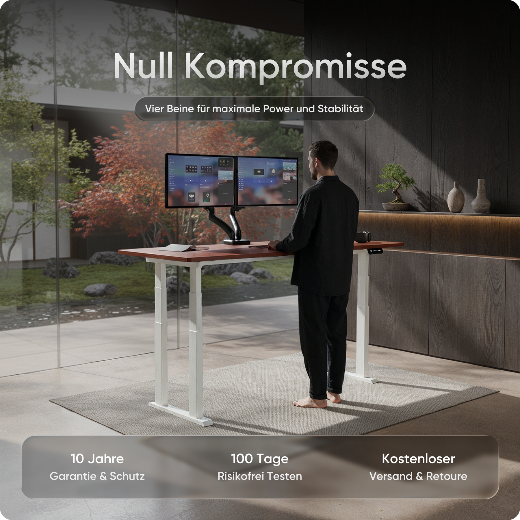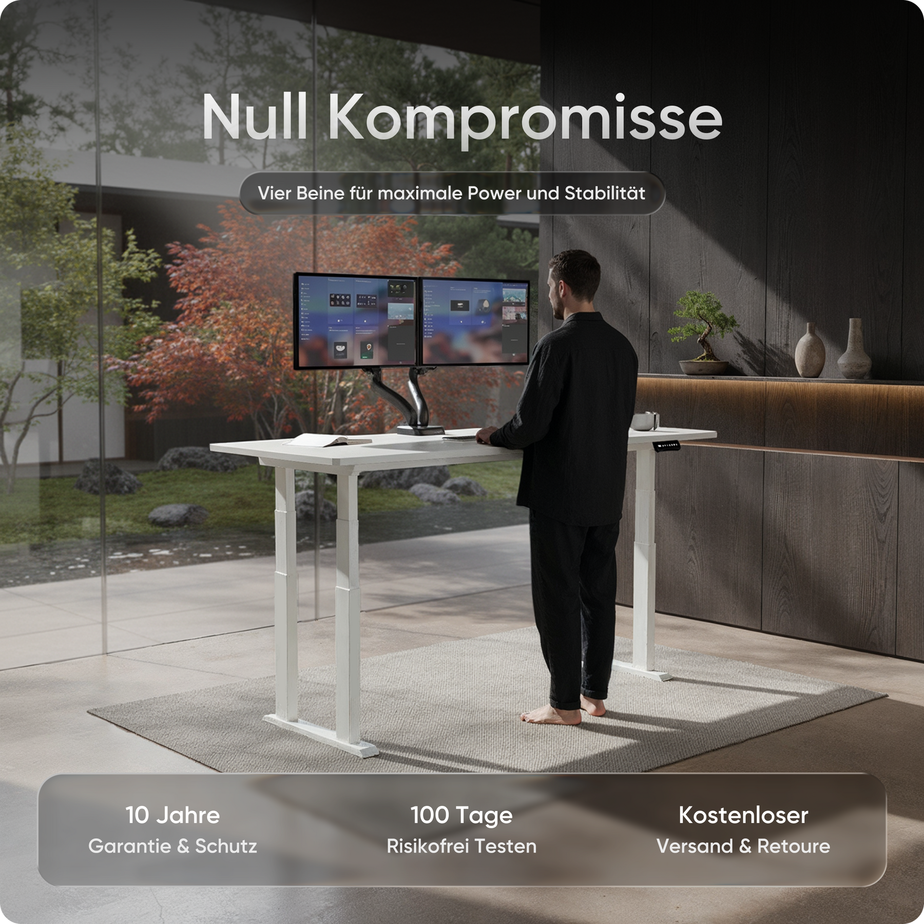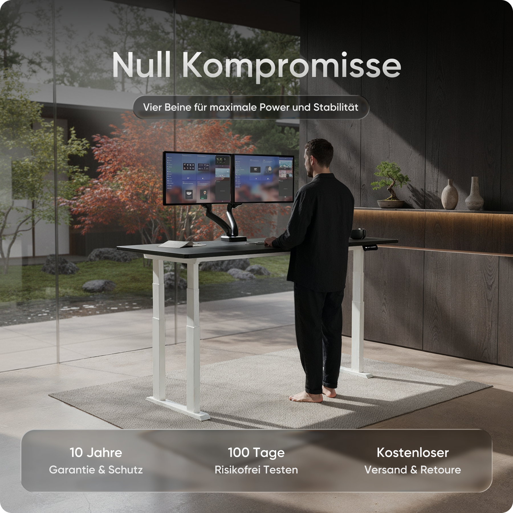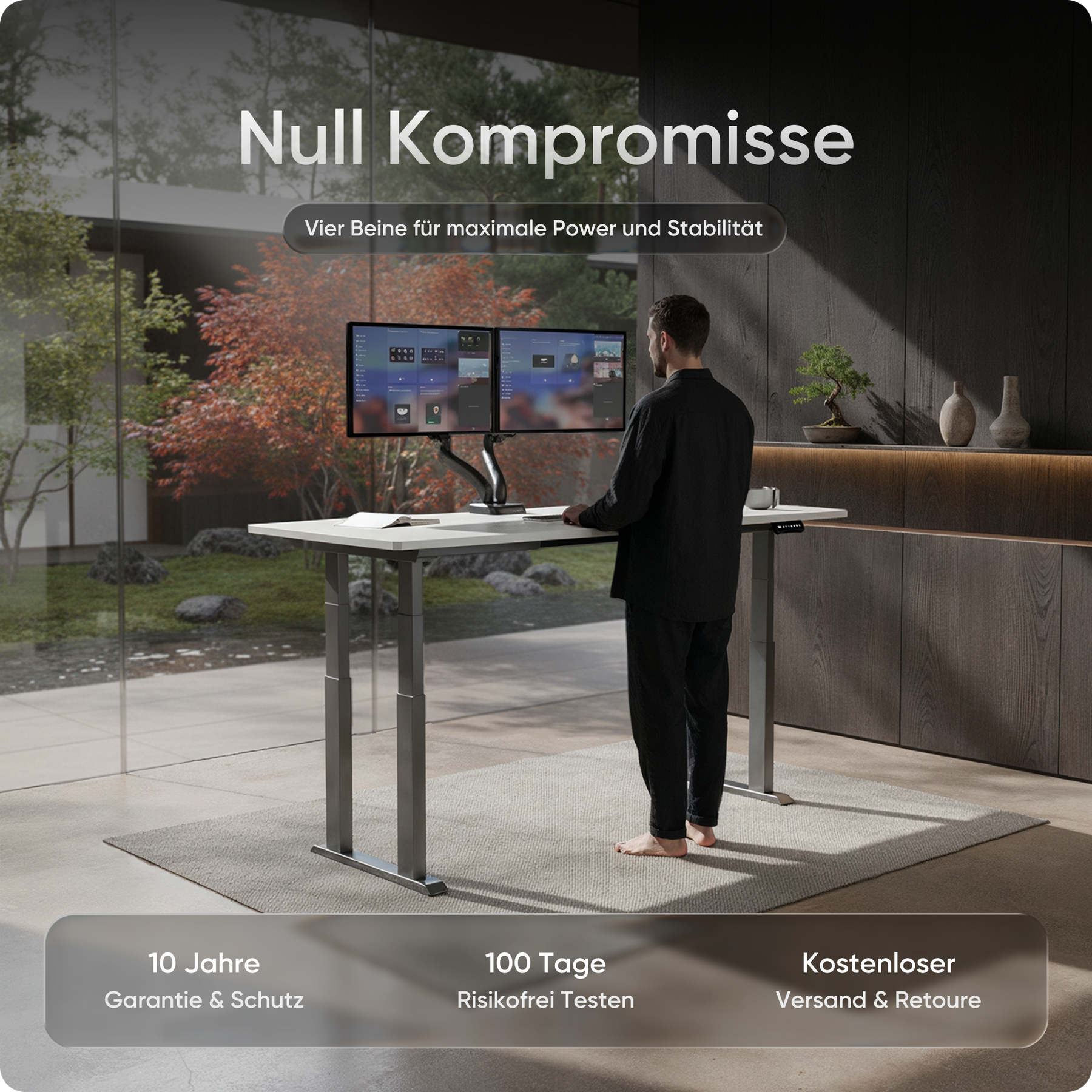 Bei DESKSPACE wissen wir, dass du deinen neuen Arbeitsplatz so schnell wie möglich einrichten möchtest. Deshalb versenden wir alle unsere elektrisch höhenverstellbaren Schreibtische direkt aus unserem Lager in der Nähe von Stuttgart. Dies garantiert eine schnelle Lieferung, meist innerhalb von 1-3 Werktagen.