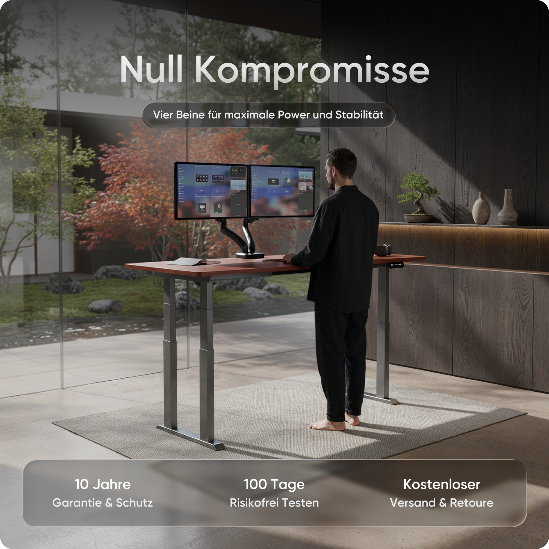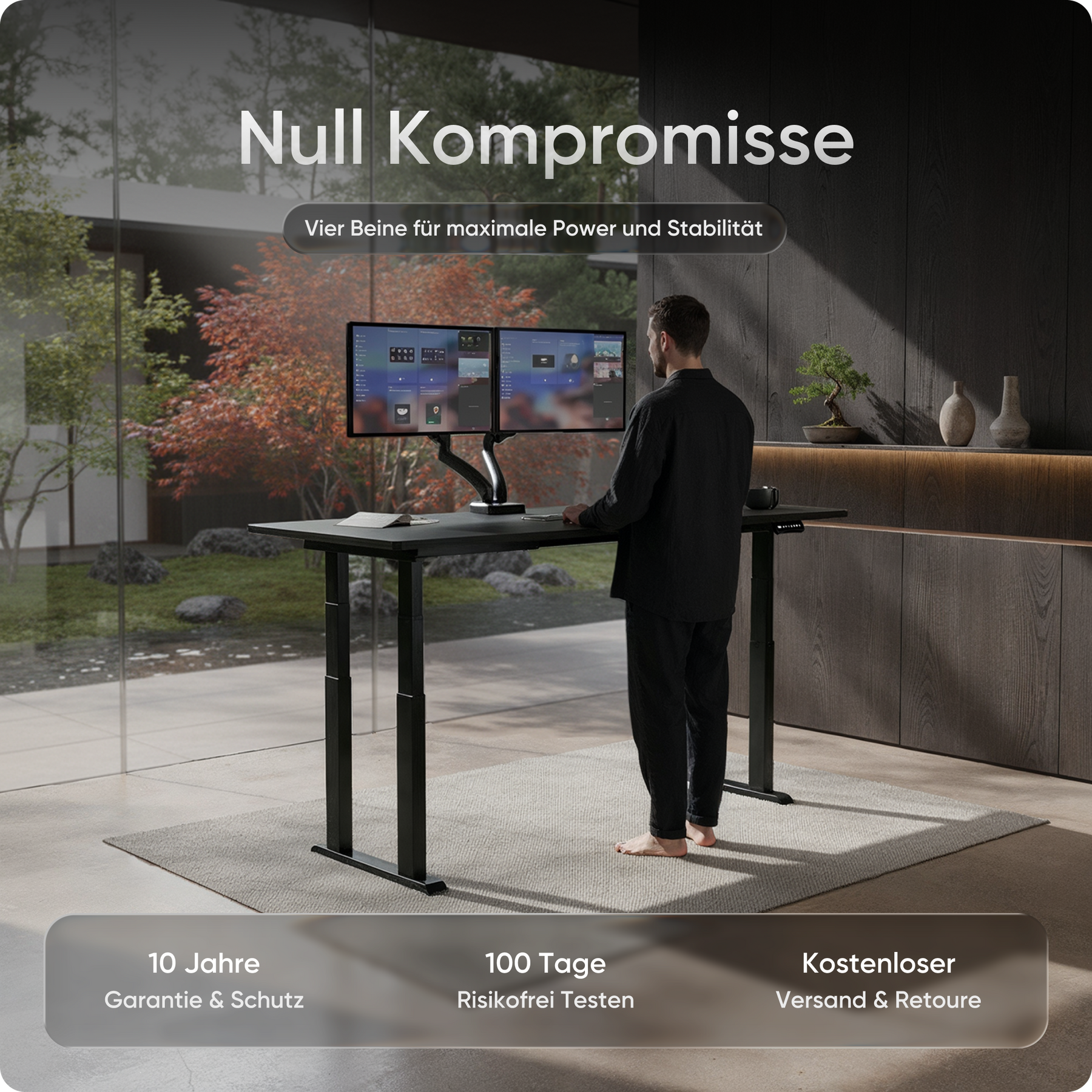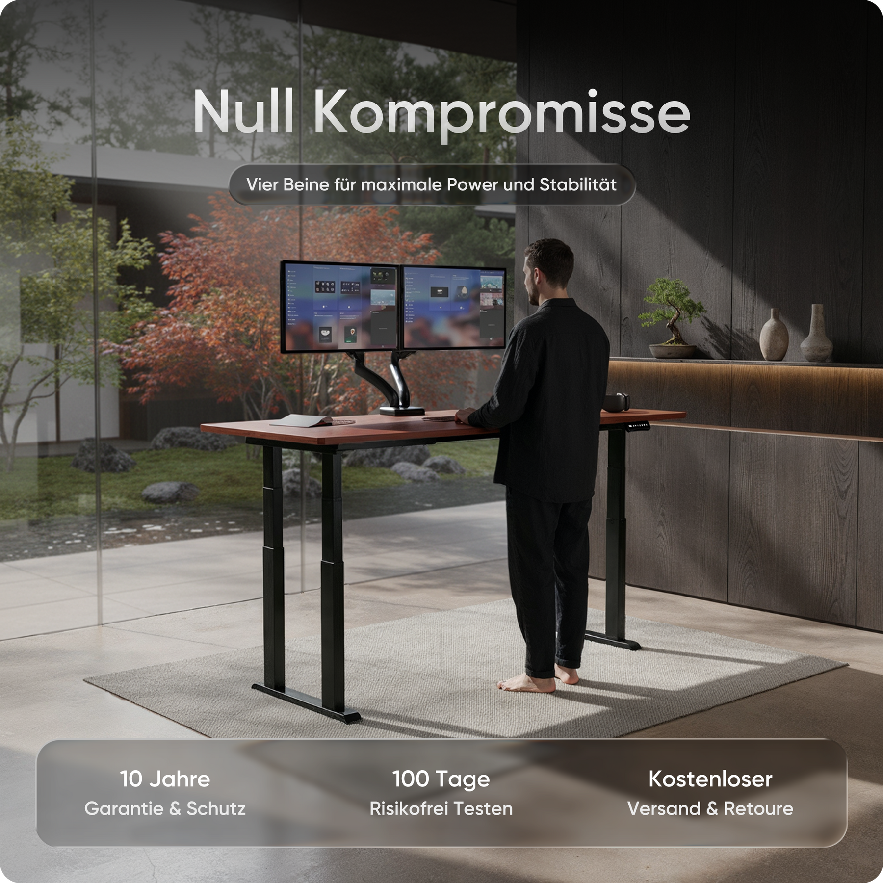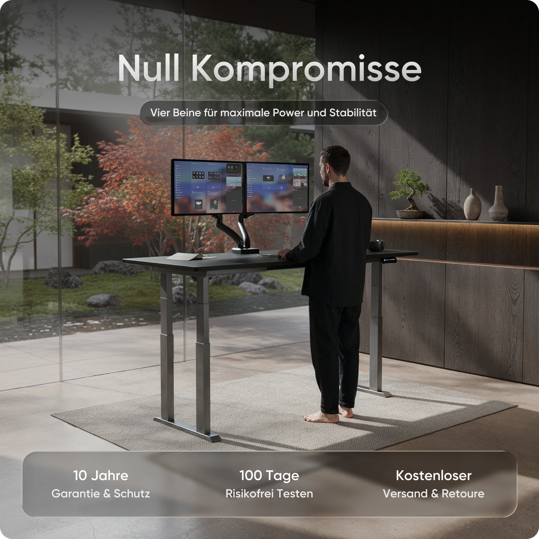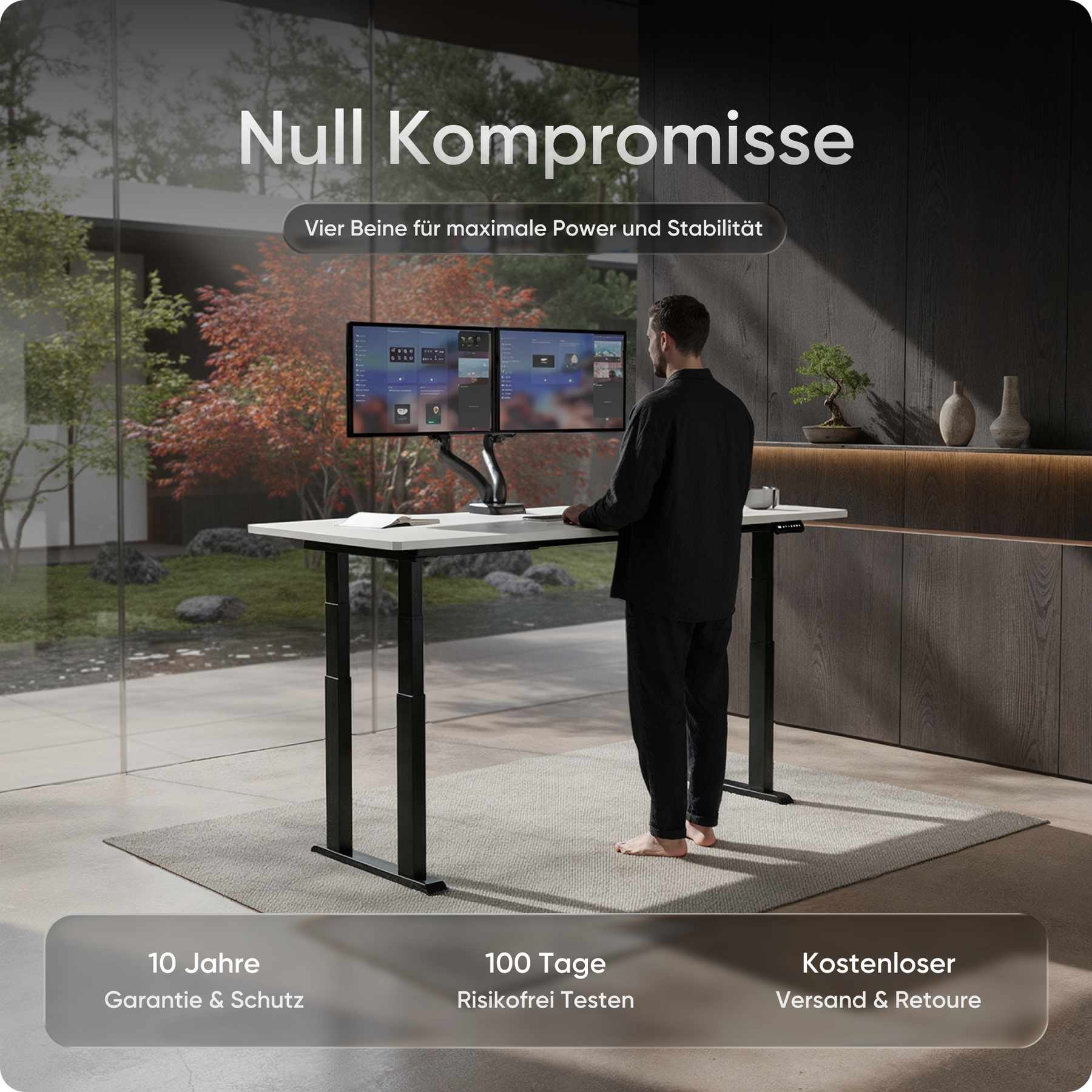 Bei DESKSPACE wissen wir, dass du deinen neuen Arbeitsplatz so schnell wie möglich einrichten möchtest. Deshalb versenden wir alle unsere elektrisch höhenverstellbaren Schreibtische direkt aus unserem Lager in der Nähe von Stuttgart. Dies garantiert eine schnelle Lieferung, meist innerhalb von 1-3 Werktagen.