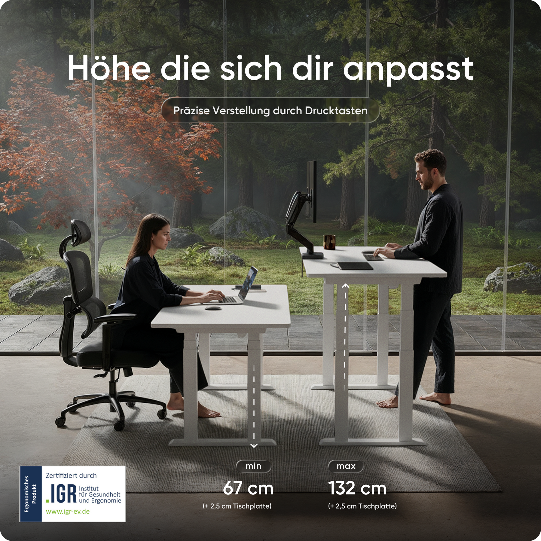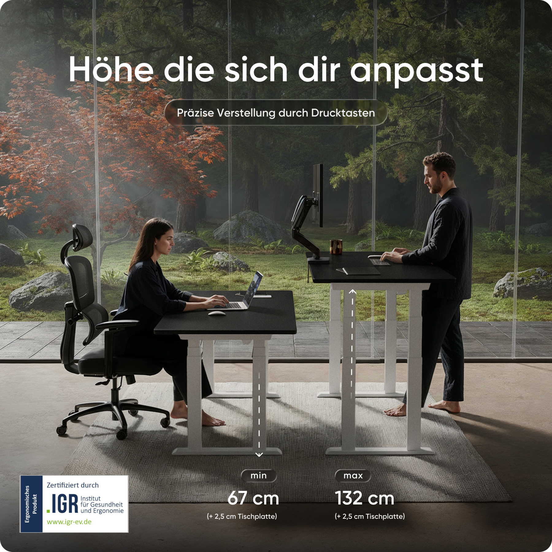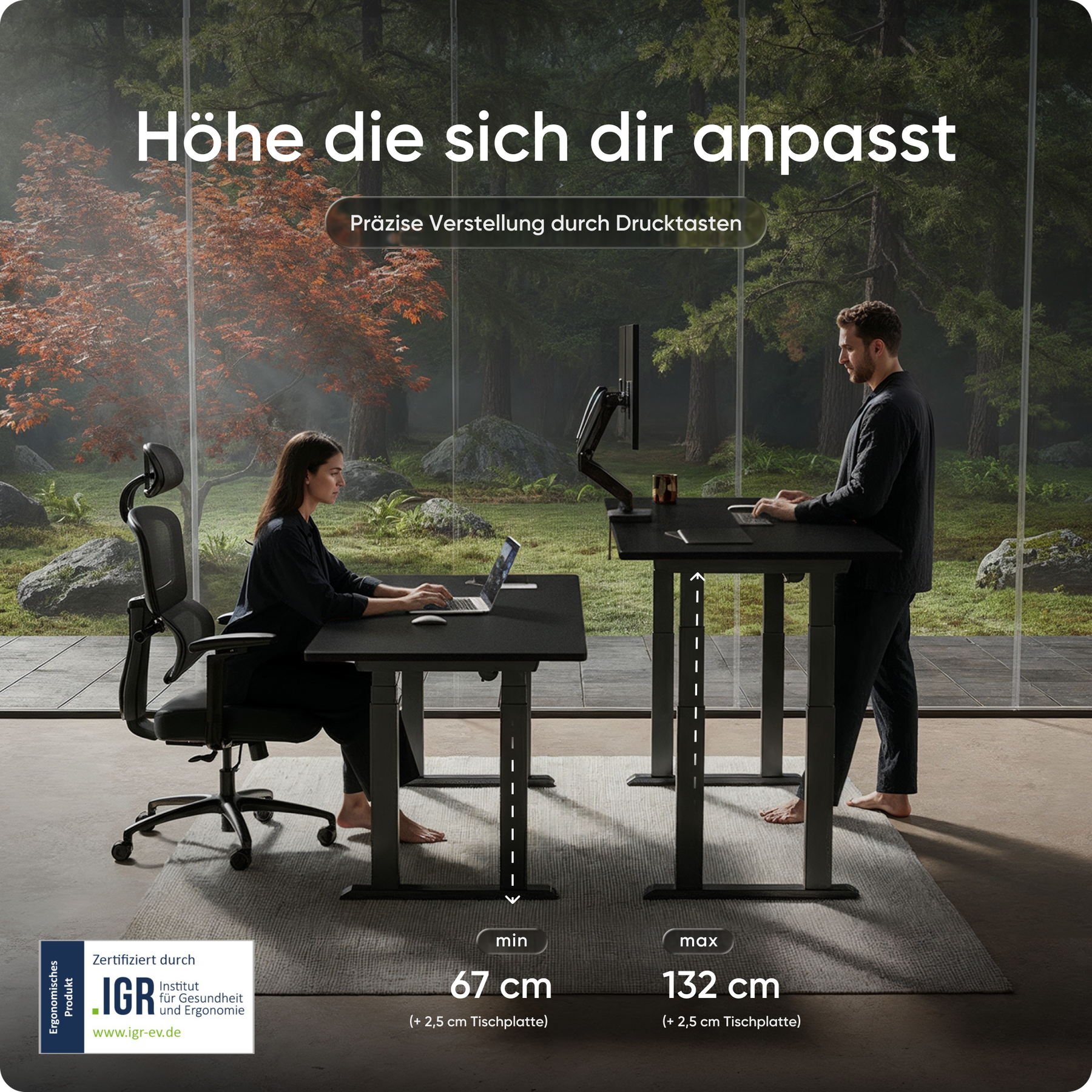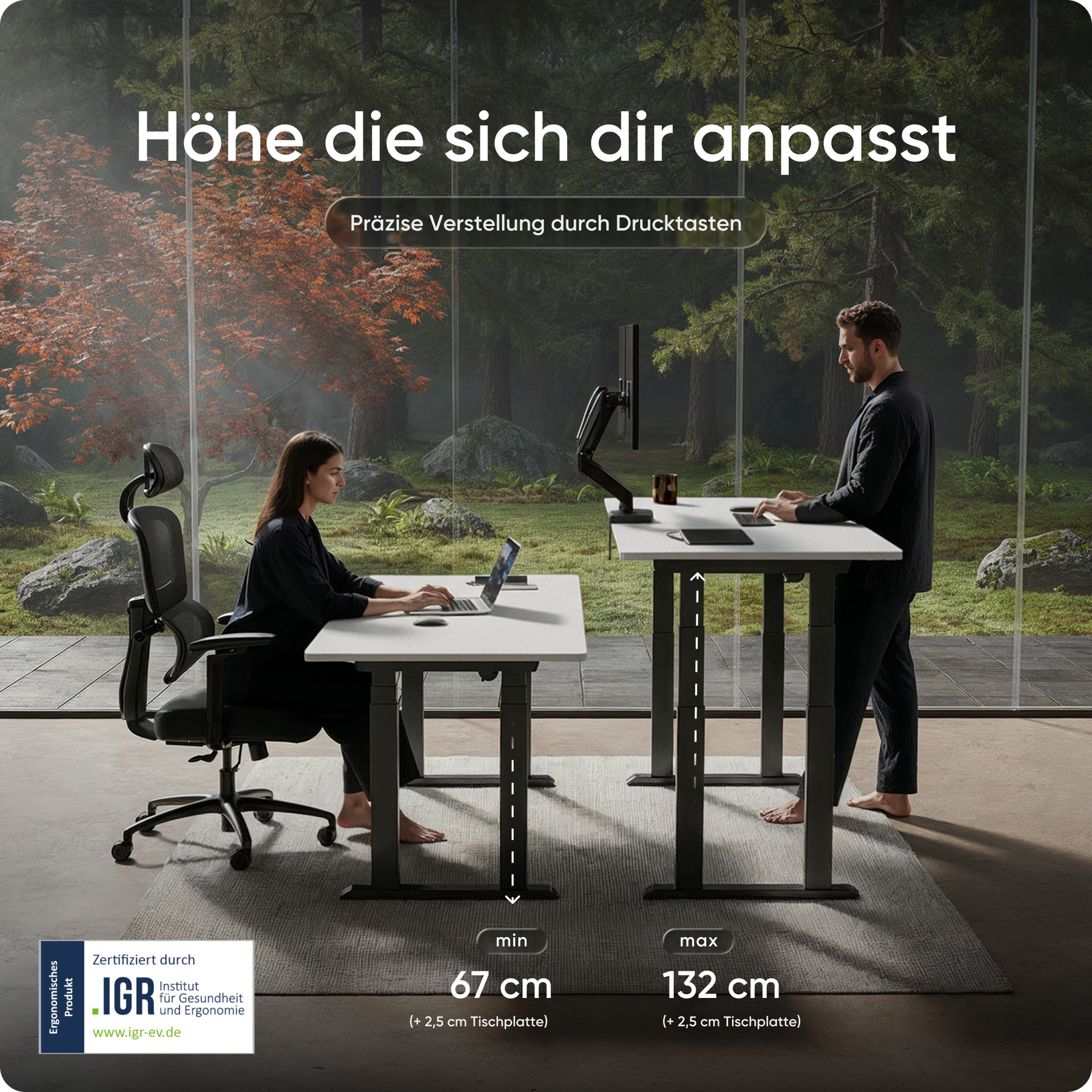 Mit einer Verstellhöhe von 67 bis 132 cm passt sich der Tisch ideal an jede Körpergröße an – von 1,50 bis über 2 Meter. Die leistungsstarken Motoren heben die Platte mit 25 mm pro Sekunde, 3x so schnell wie herkömmliche Modelle. Belastbar bis 200 kg und über 30.000-fach getestet.