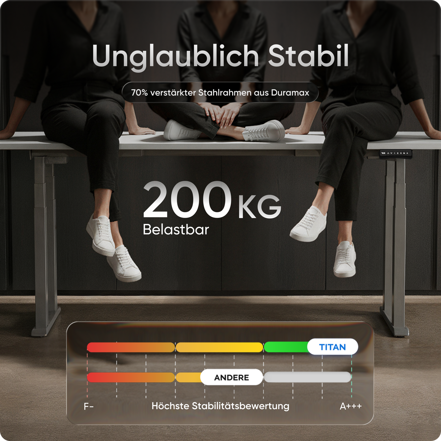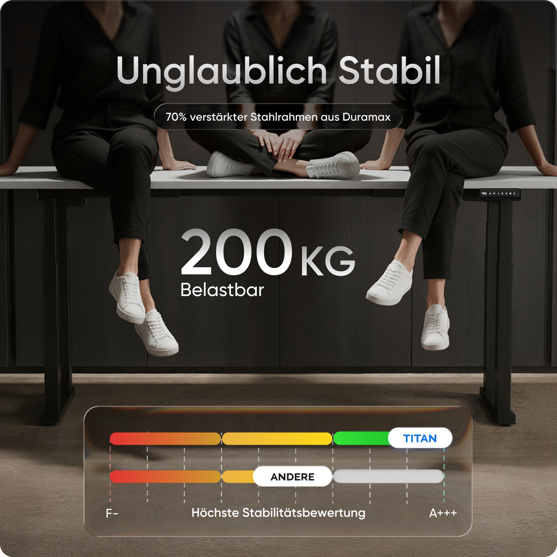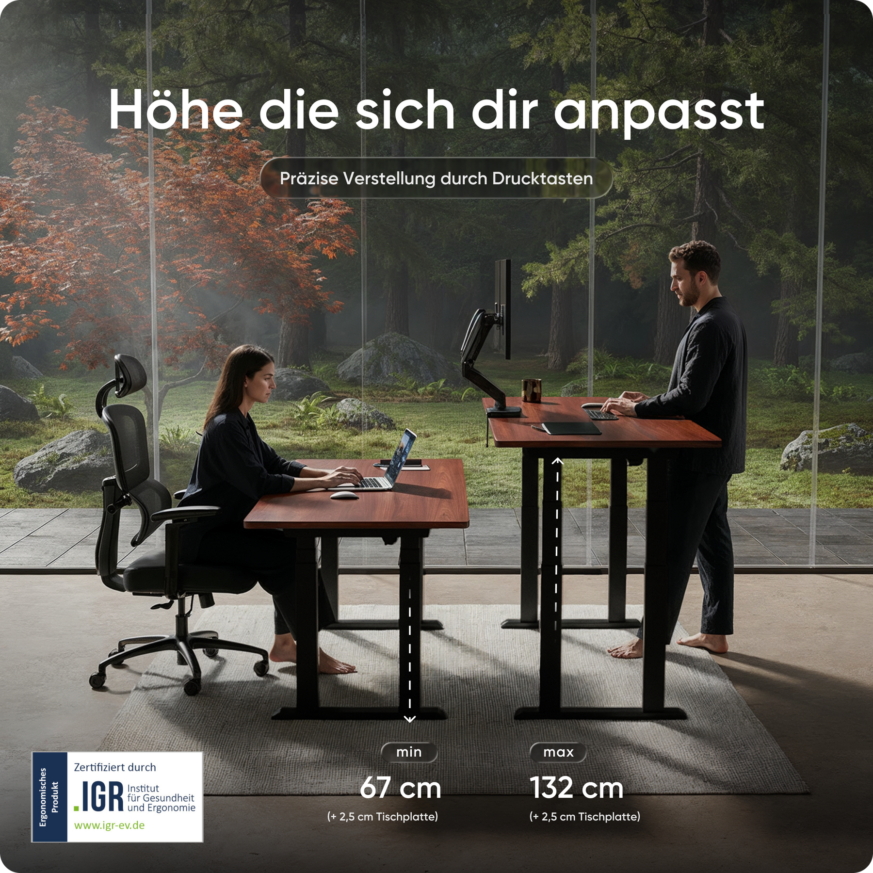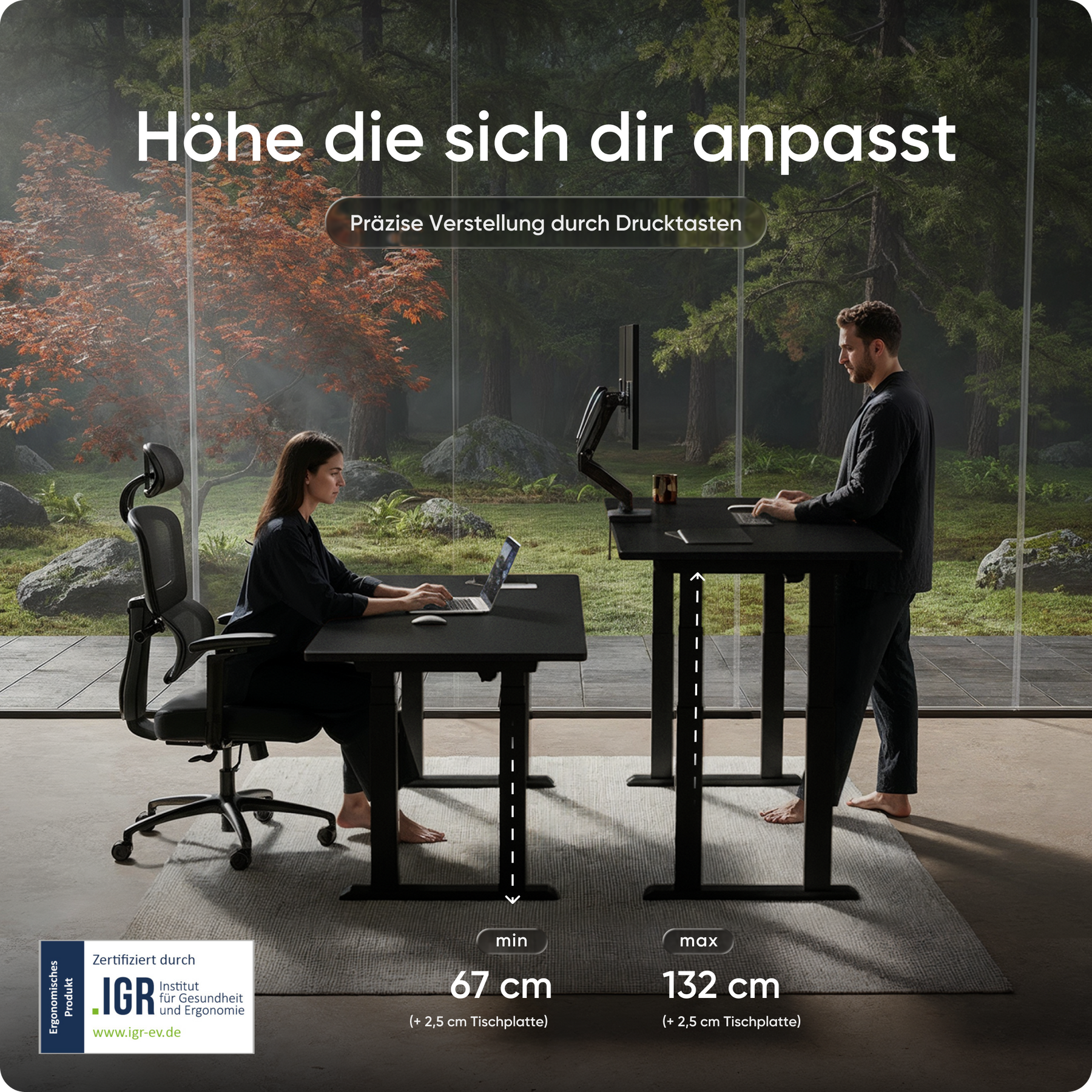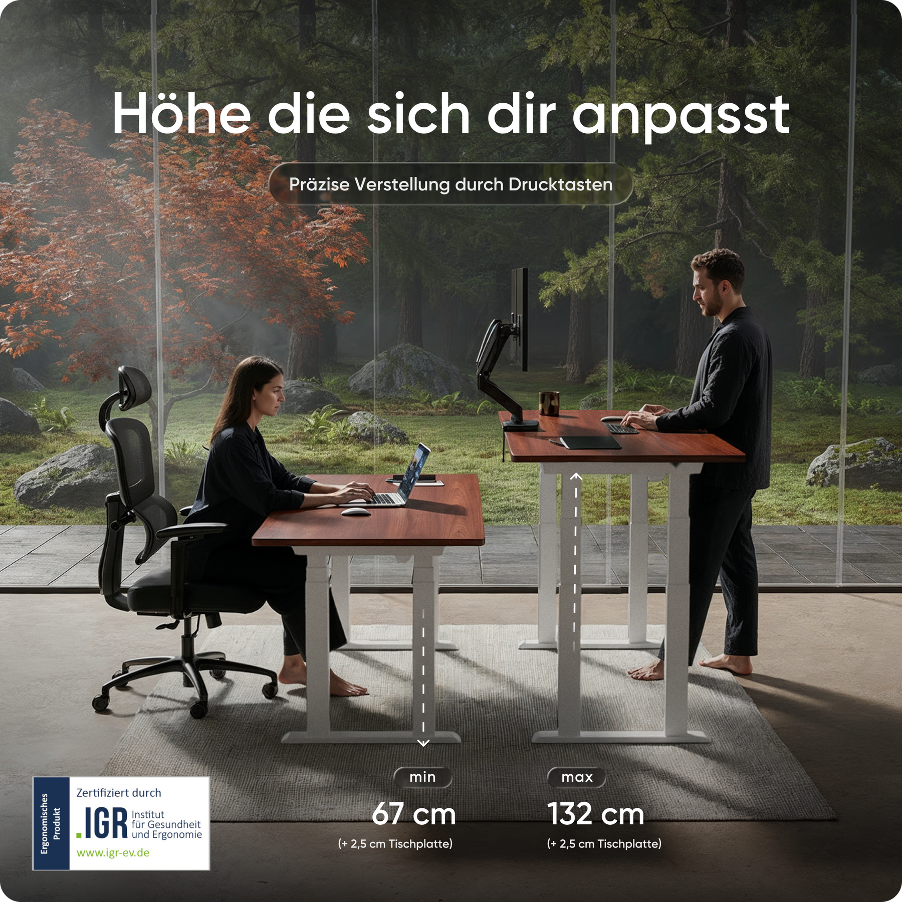 Mit einer Verstellhöhe von 67 bis 132 cm passt sich der Tisch ideal an jede Körpergröße an – von 1,50 bis über 2 Meter. Die leistungsstarken Motoren heben die Platte mit 25 mm pro Sekunde, 3x so schnell wie herkömmliche Modelle. Belastbar bis 200 kg und über 30.000-fach getestet.