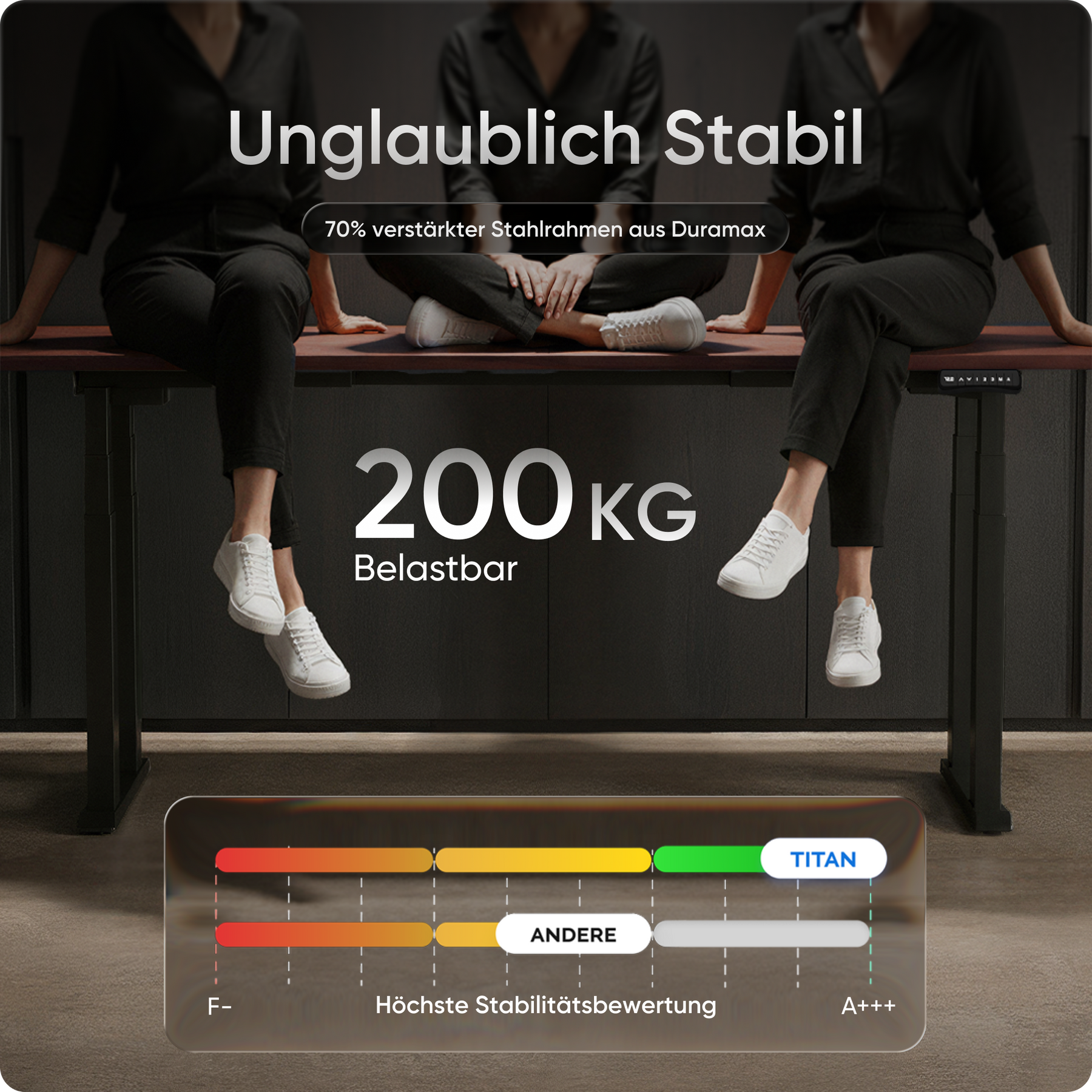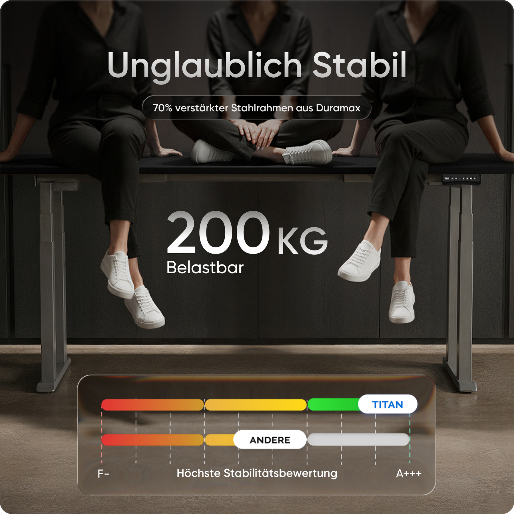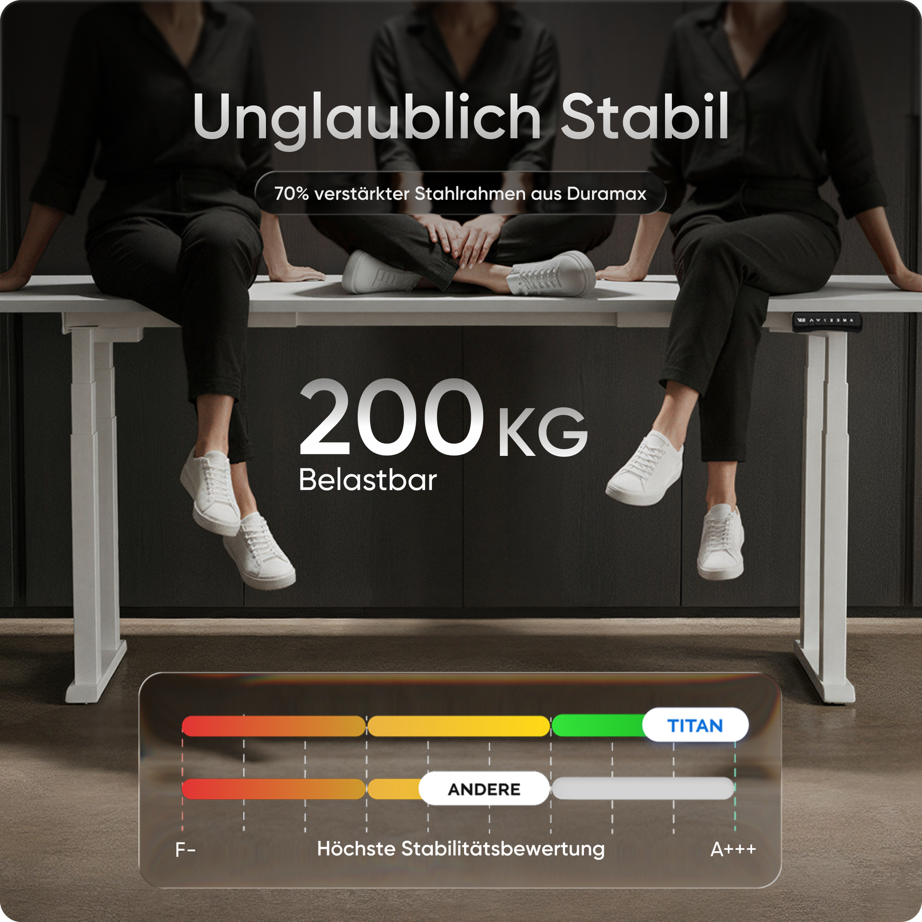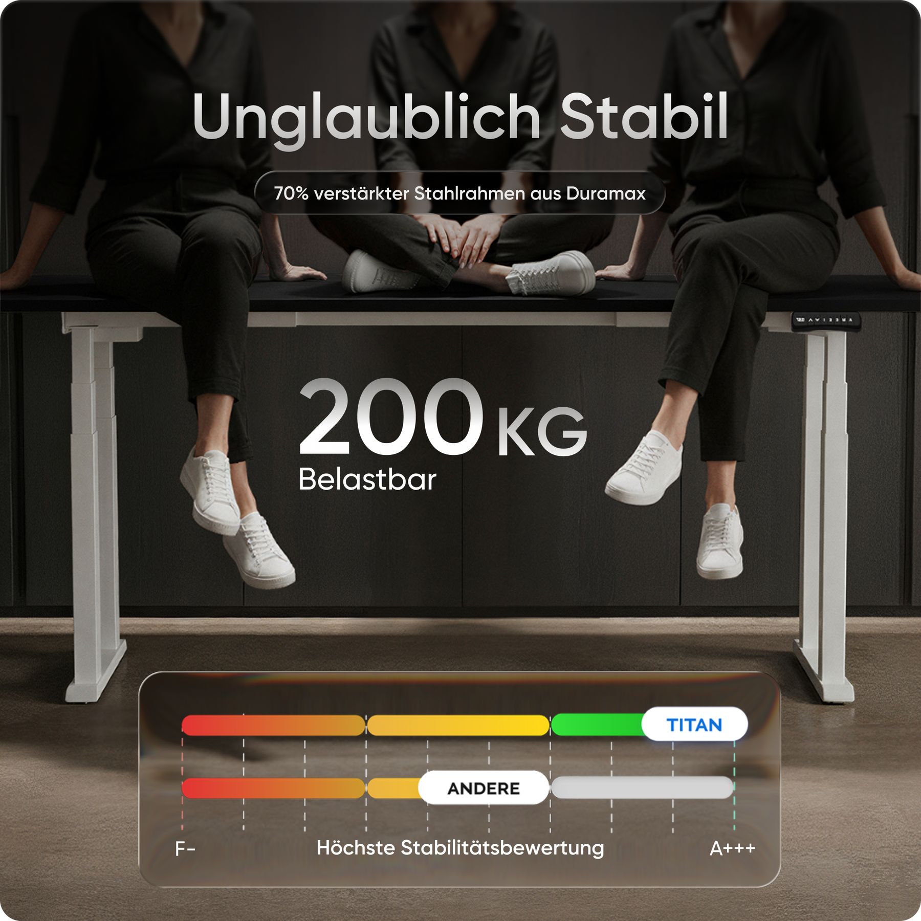 Mit einer Verstellhöhe von 67 bis 132 cm passt sich der Tisch ideal an jede Körpergröße an – von 1,50 bis über 2 Meter. Die leistungsstarken Motoren heben die Platte mit 25 mm pro Sekunde, 3x so schnell wie herkömmliche Modelle. Belastbar bis 200 kg und über 30.000-fach getestet.