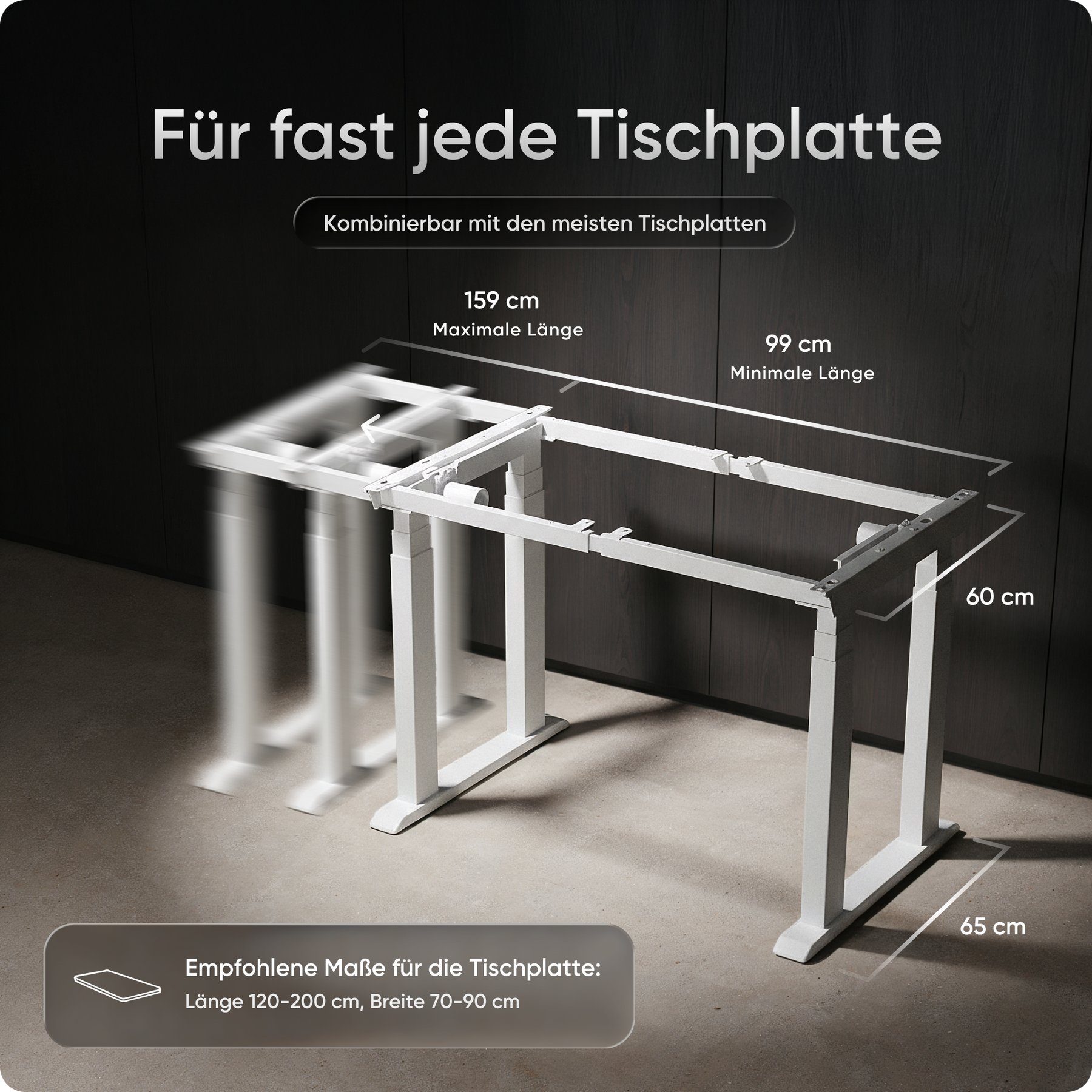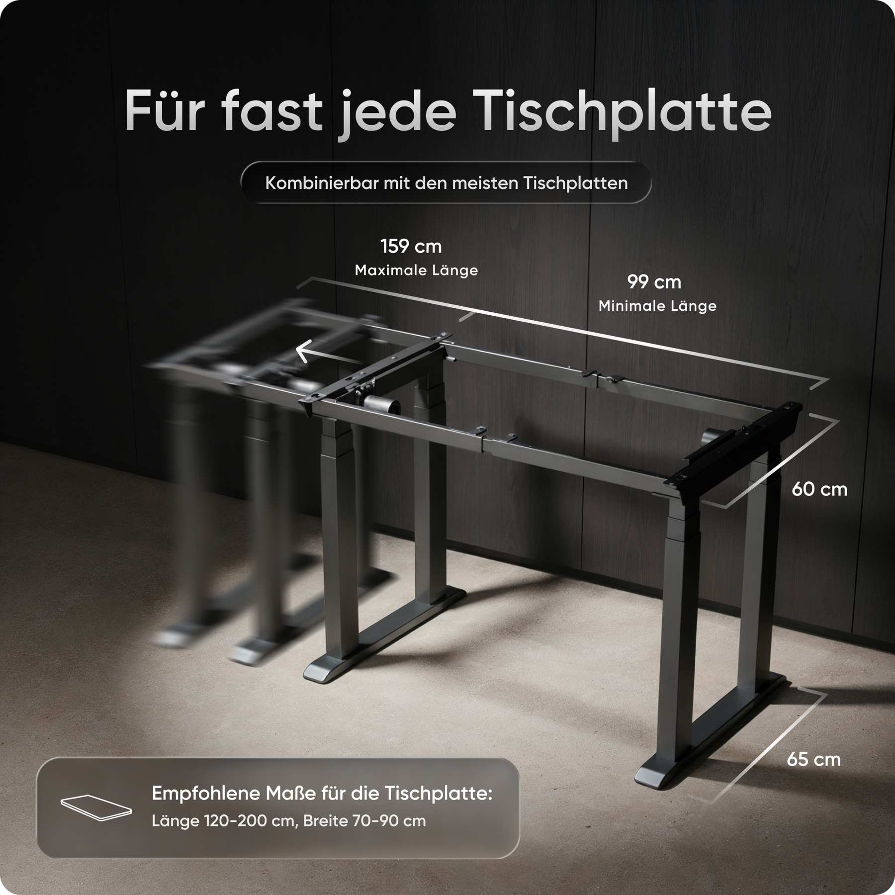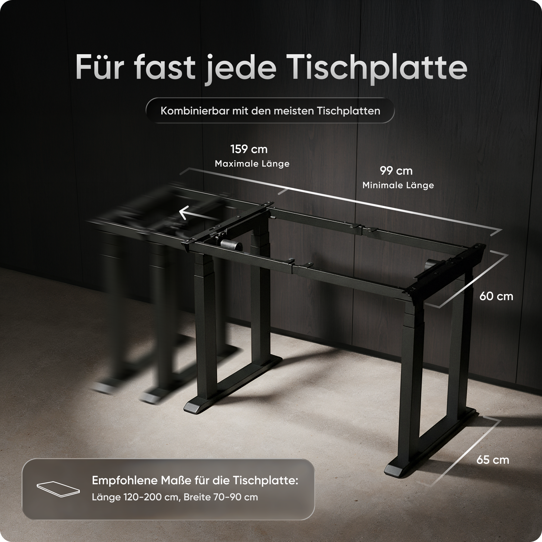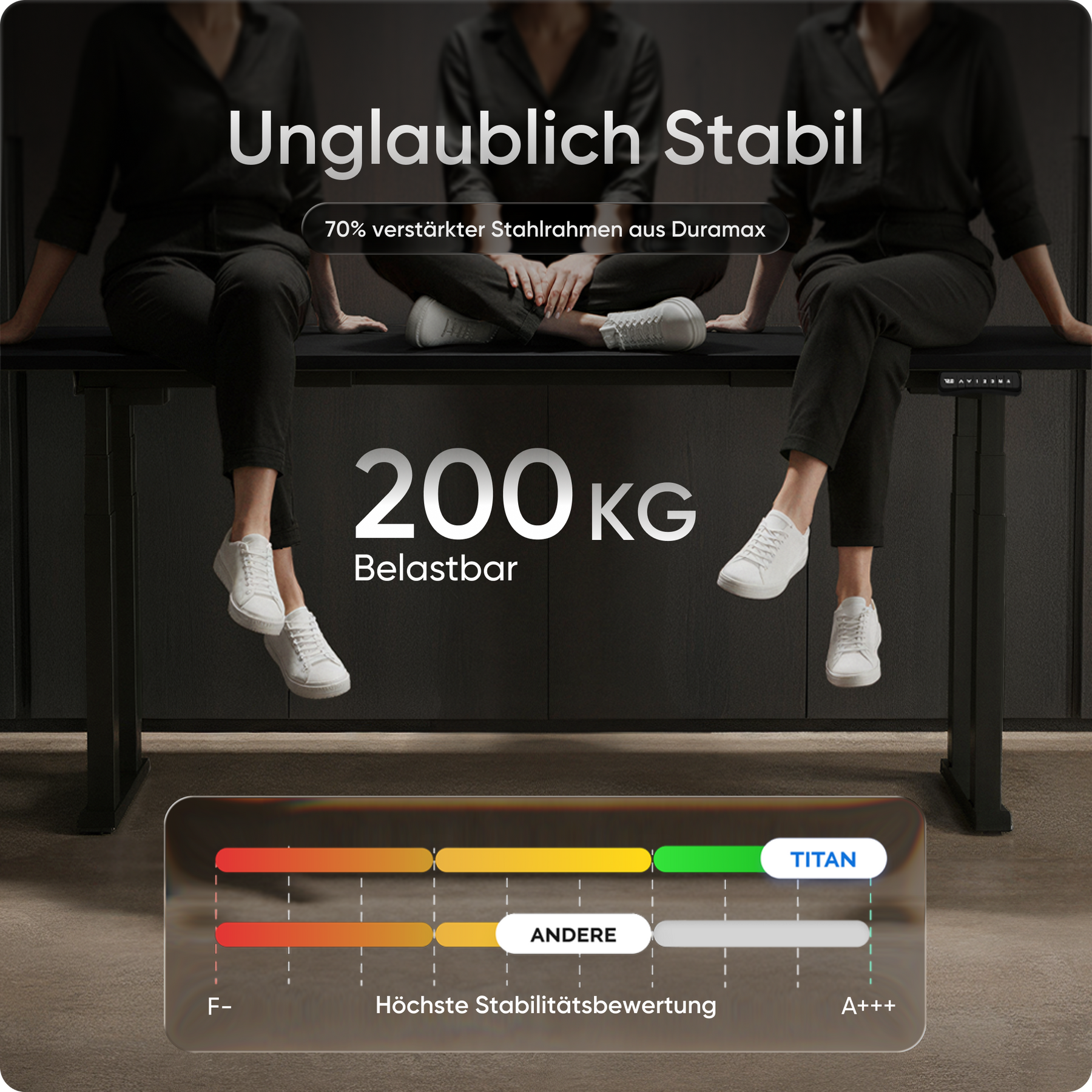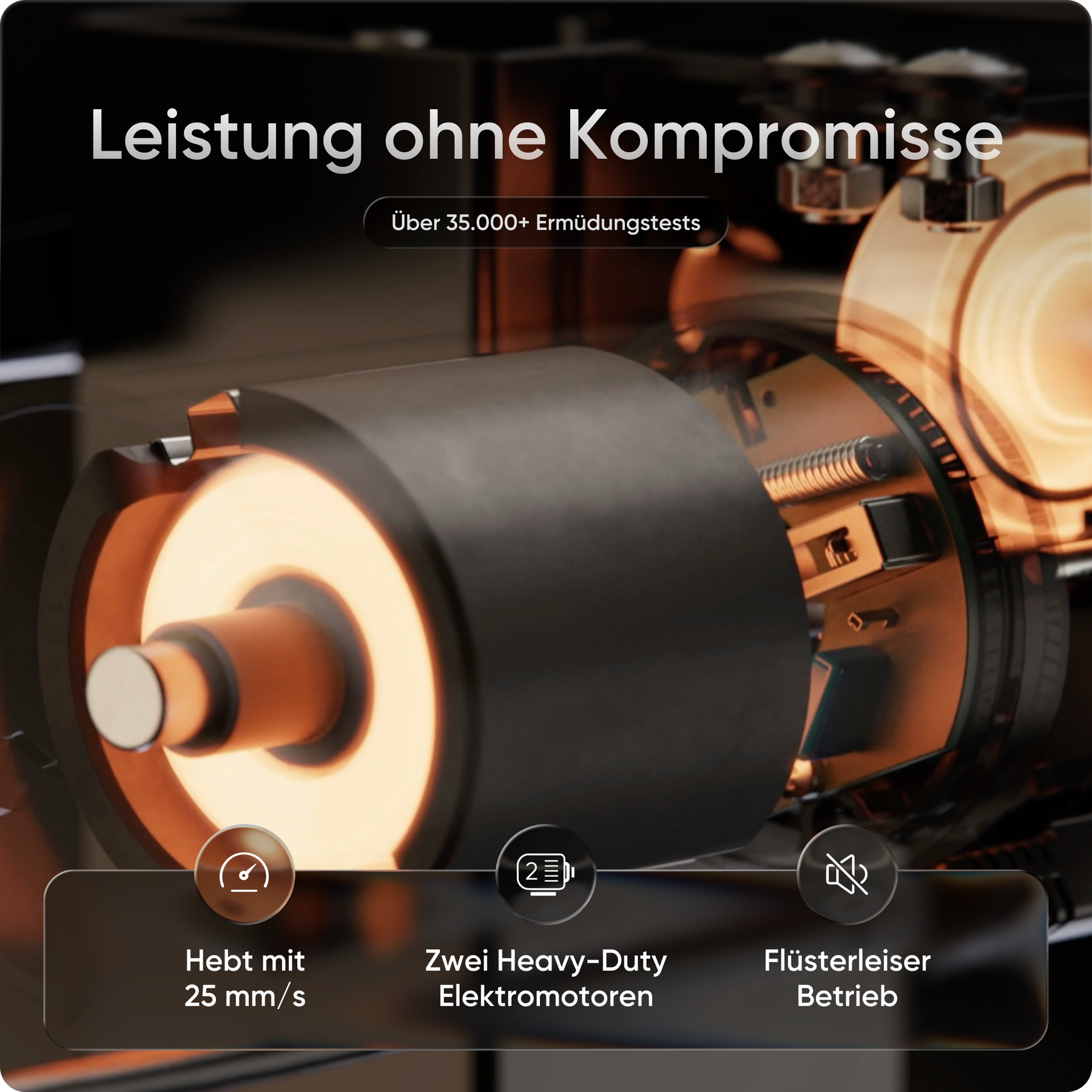 Mit einer Verstellhöhe von 67 bis 132 cm passt sich der Tisch ideal an jede Körpergröße an – von 1,50 bis über 2 Meter. Die leistungsstarken Motoren heben die Platte mit 25 mm pro Sekunde, 3x so schnell wie herkömmliche Modelle. Belastbar bis 200 kg und über 30.000-fach getestet.