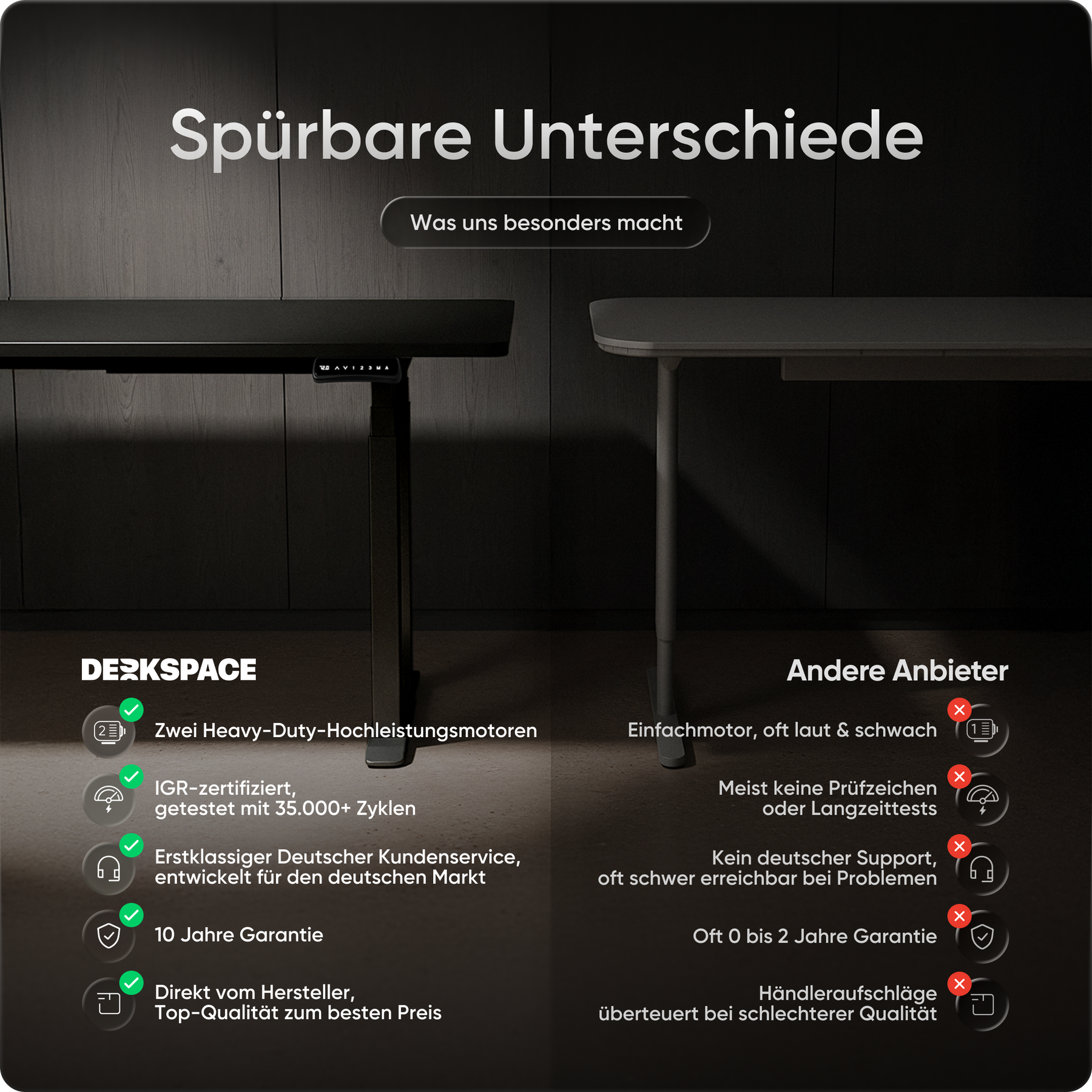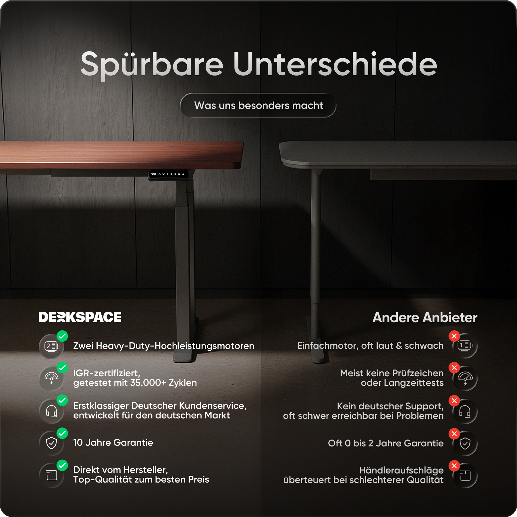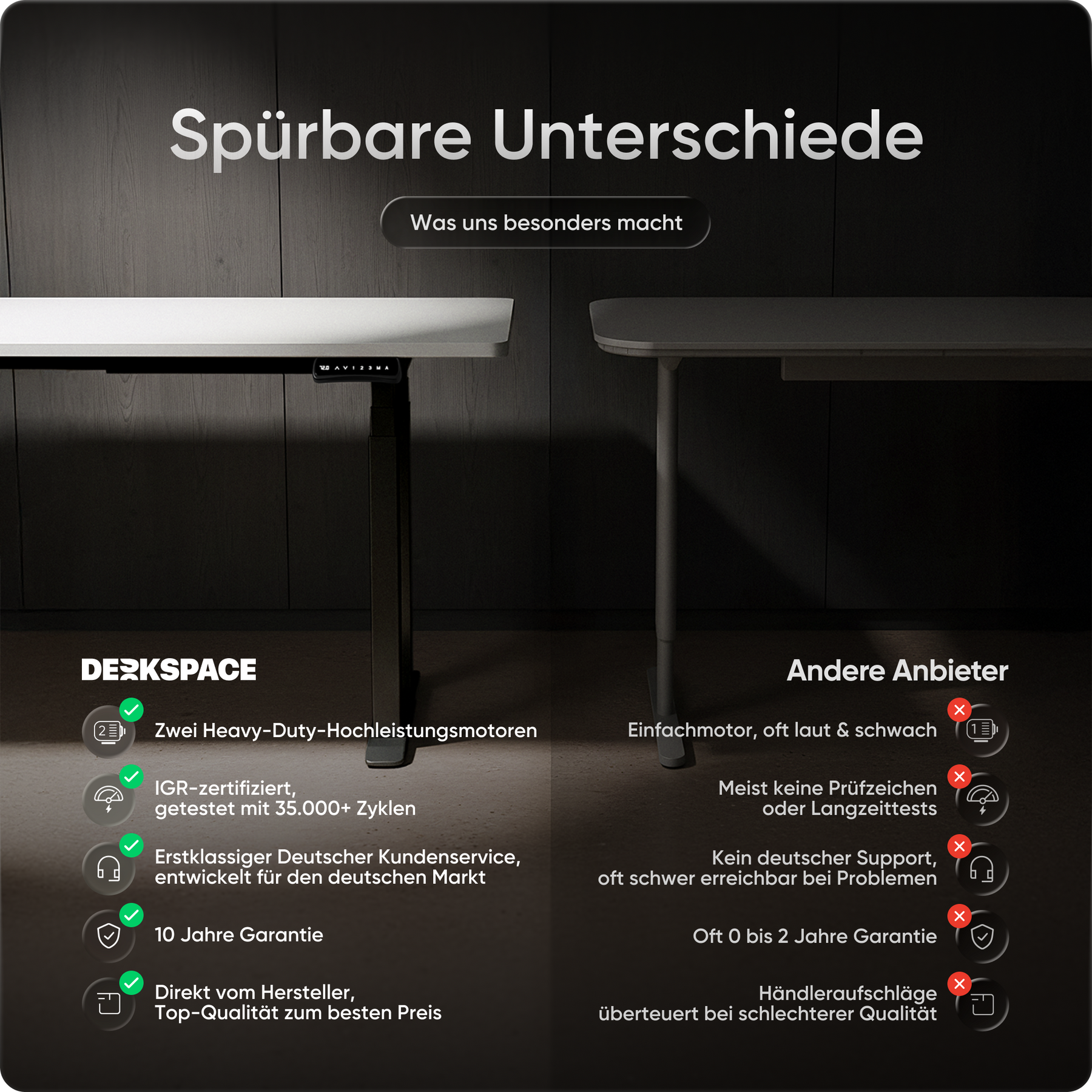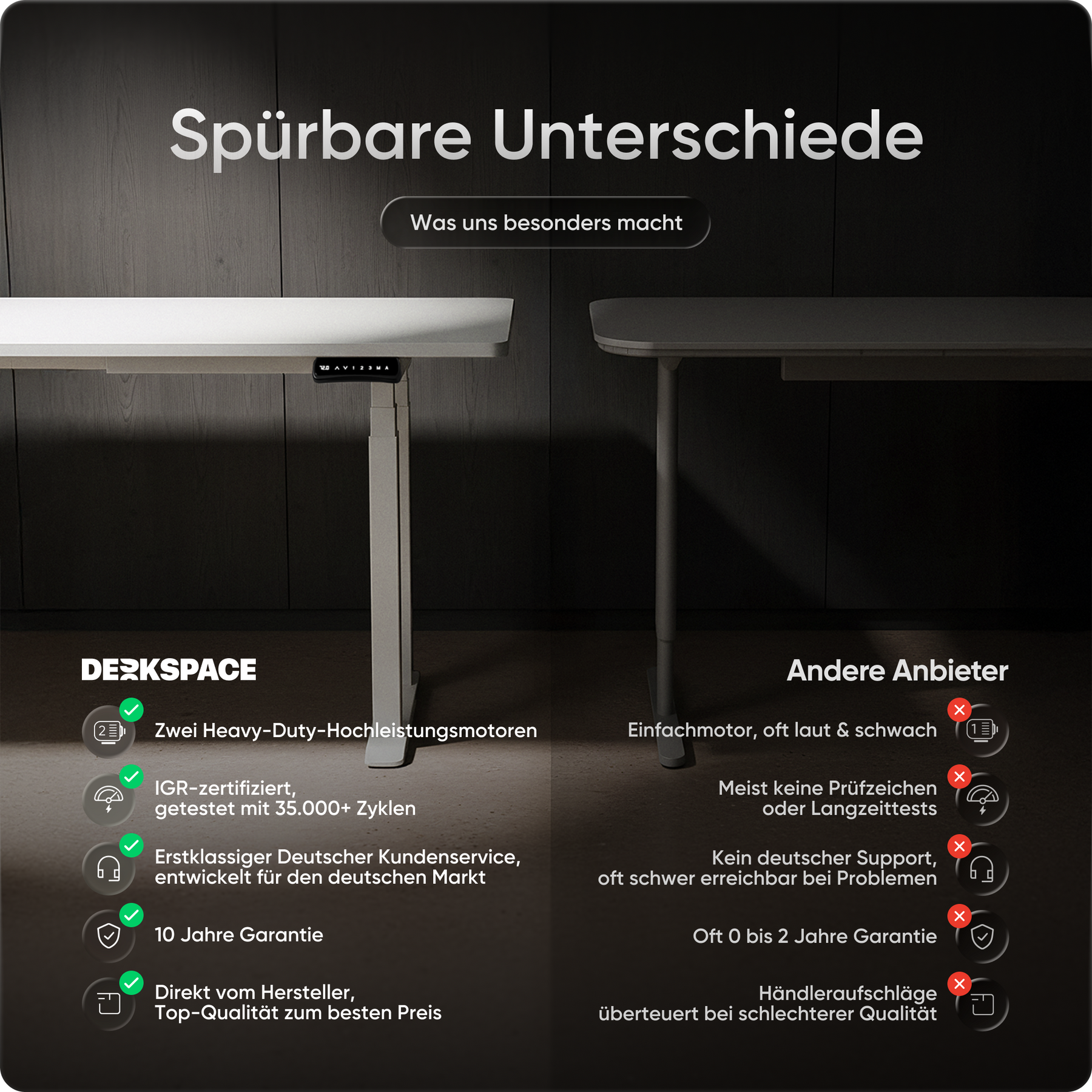 Chez DESKSPACE, nous misons sur les normes de qualité les plus élevées, sans le prix élevé. Nos bureaux électriques réglables en hauteur sont synonymes de qualité exceptionnelle, de stabilité inégalée et de satisfaction client sans précédent. Alors que d'autres marques économisent sur la qualité ou gonflent les prix, nous offrons le meilleur rapport qualité-prix du marché. Avec jusqu'à 10 ans de garantie, 100 jours d'essai gratuit et une livraison ultra-rapide en 1 à 3 jours, DESKSPACE est le choix intelligent et économique.