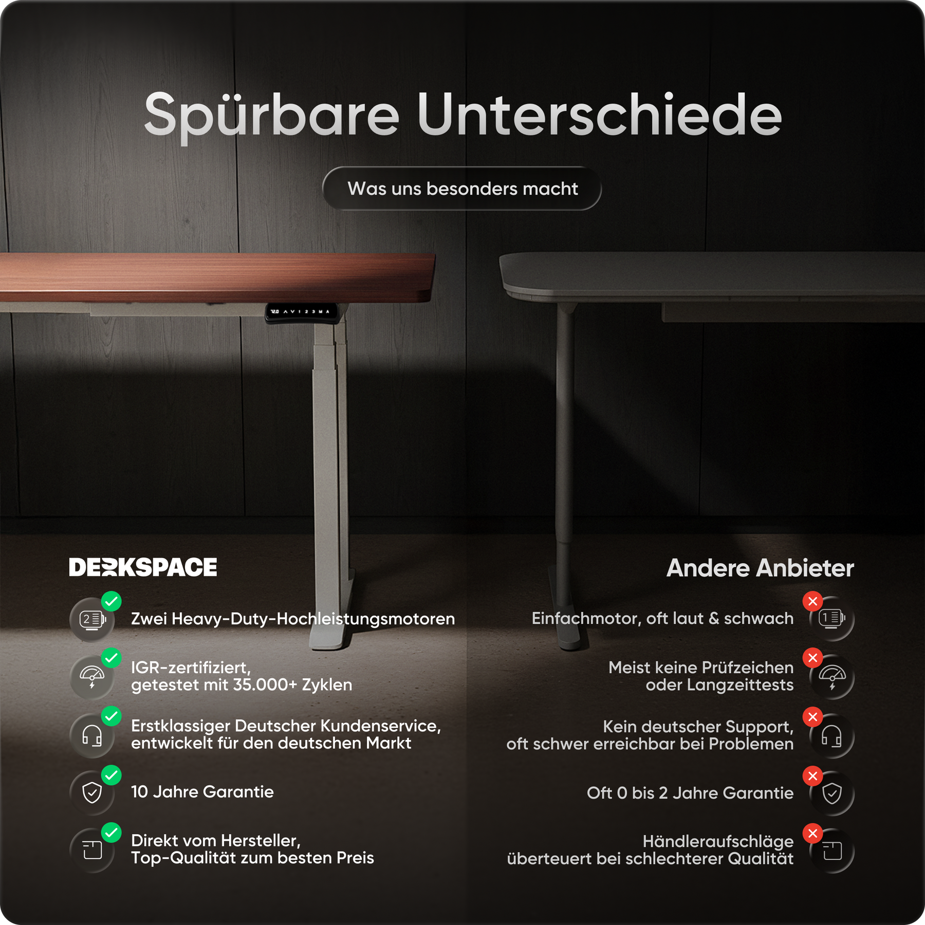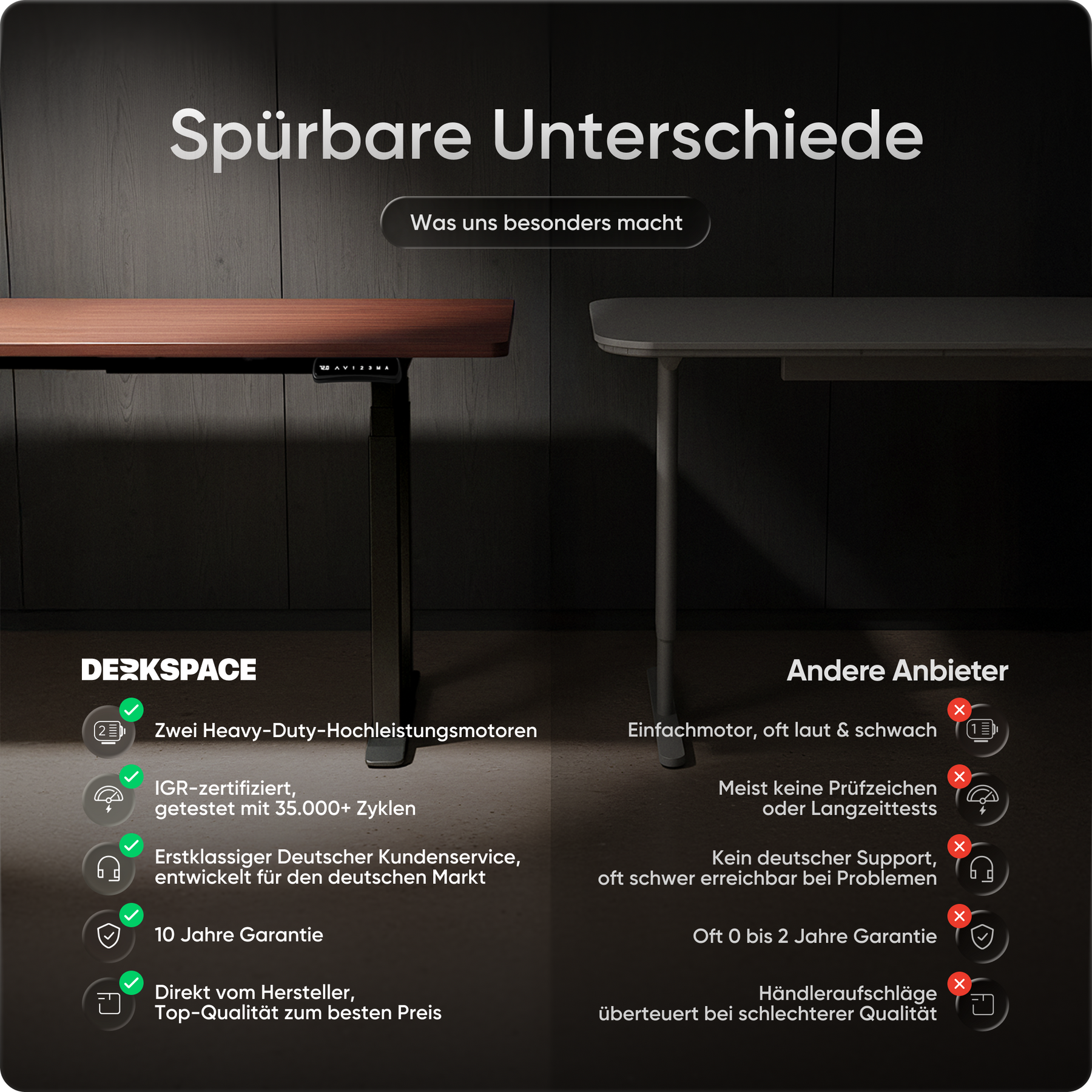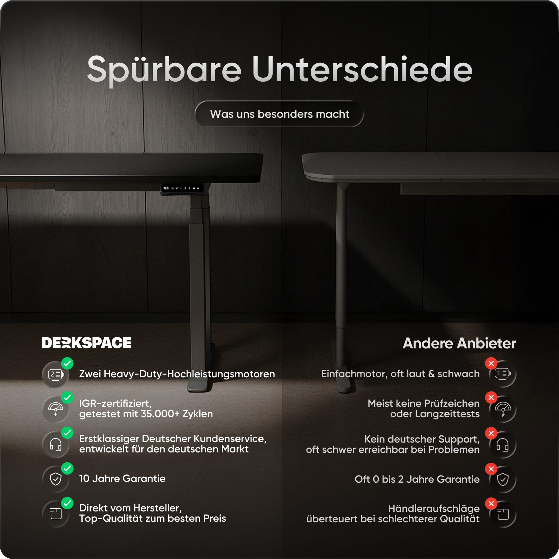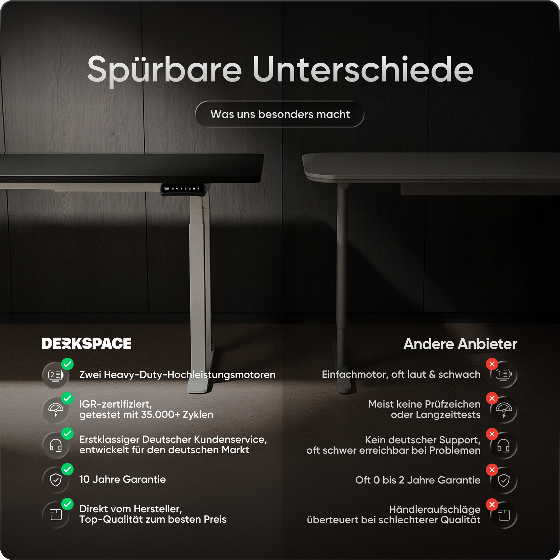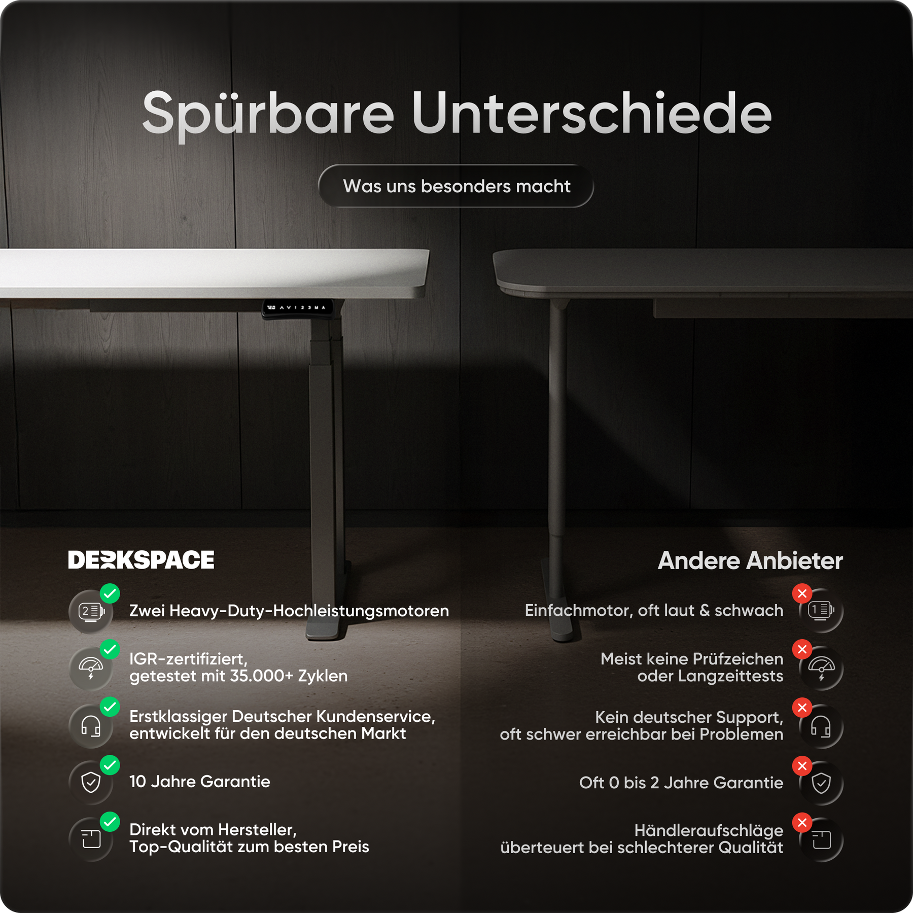 Chez DESKSPACE, nous misons sur les normes de qualité les plus élevées, sans le prix élevé. Nos bureaux électriques réglables en hauteur sont synonymes de qualité exceptionnelle, de stabilité inégalée et de satisfaction client sans précédent. Alors que d'autres marques économisent sur la qualité ou gonflent les prix, nous offrons le meilleur rapport qualité-prix du marché. Avec jusqu'à 10 ans de garantie, 100 jours d'essai gratuit et une livraison ultra-rapide en 1 à 3 jours, DESKSPACE est le choix intelligent et économique.
