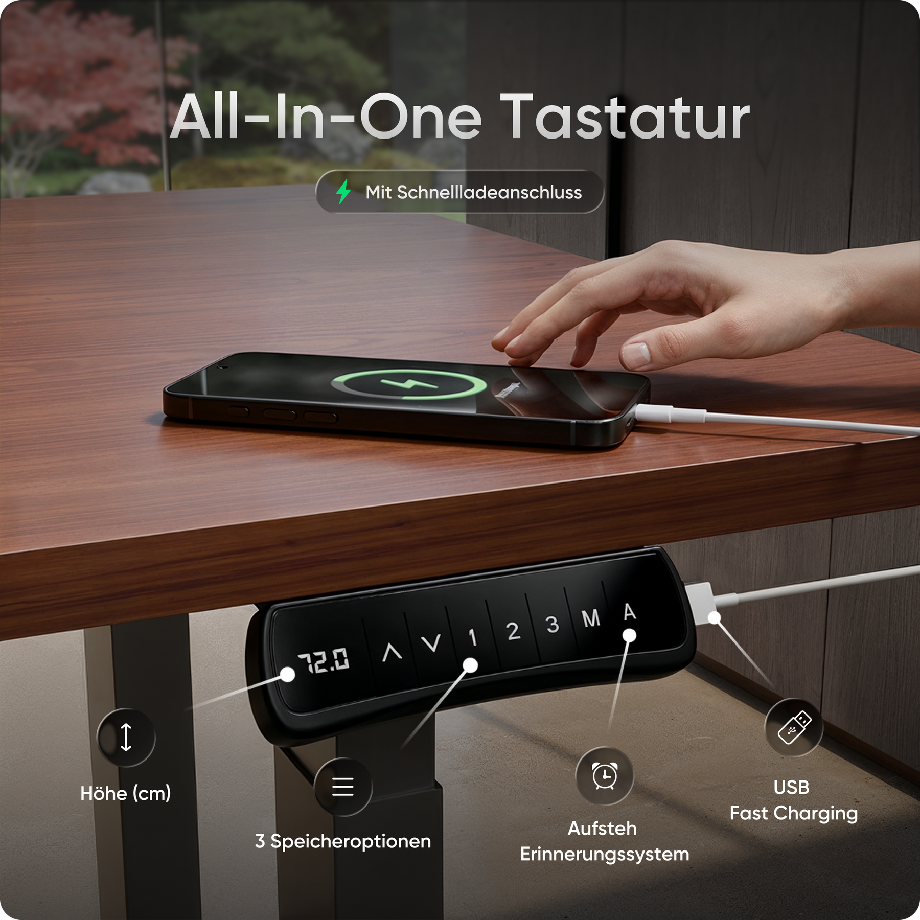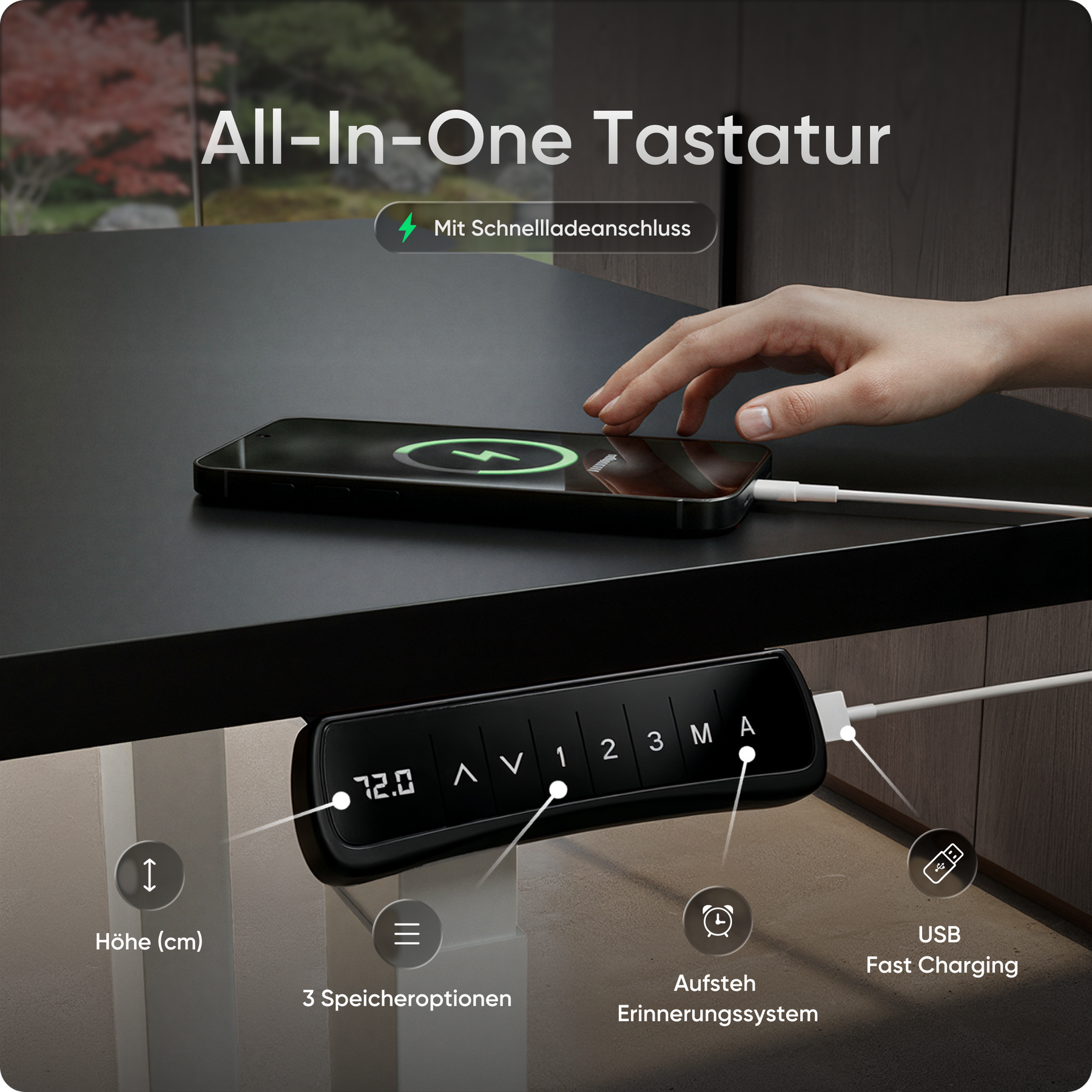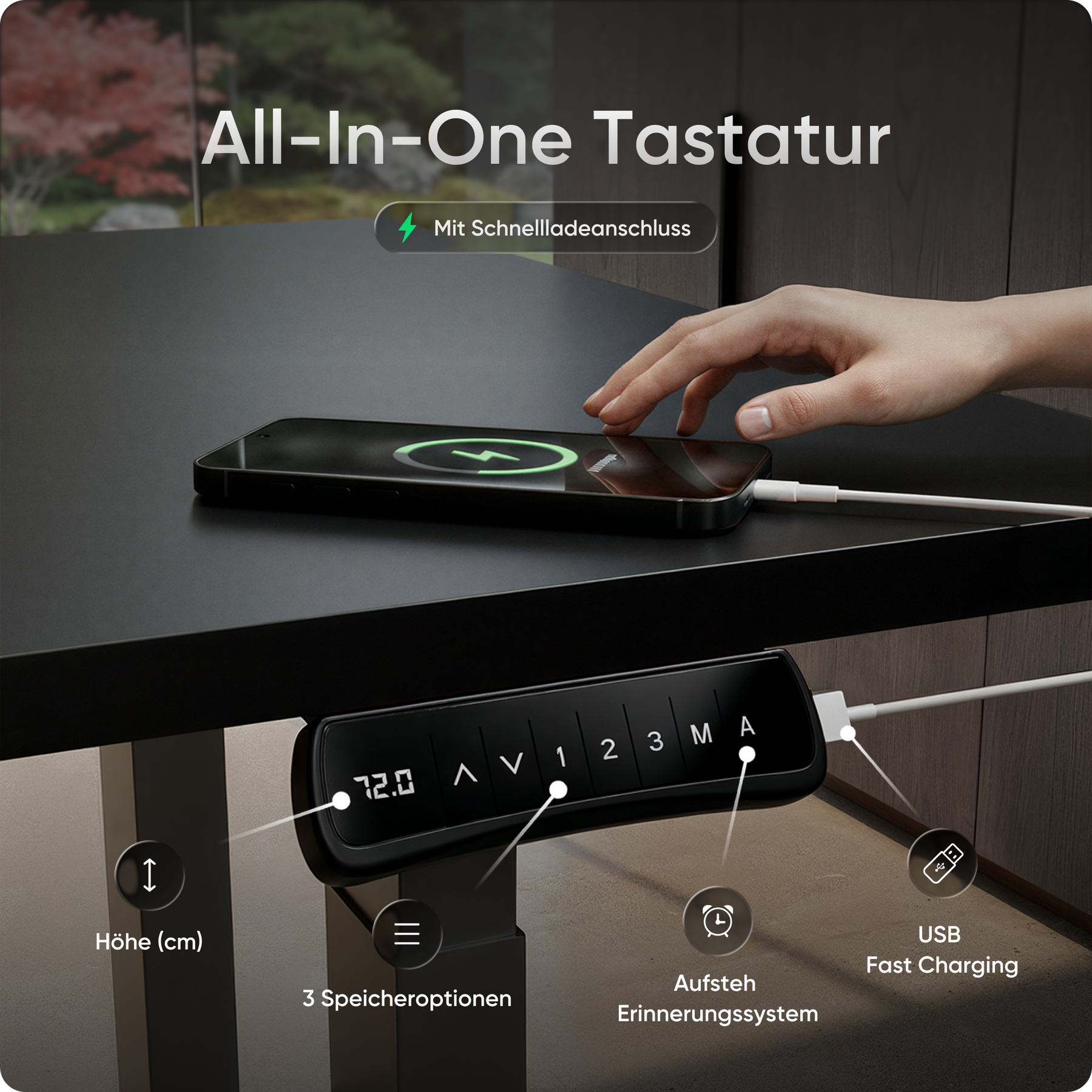 Speichere bis zu drei bevorzugte Höhen und wechsle per Knopfdruck zwischen Sitz- und Stehposition. Ein integrierter Timer erinnert dich auf Wunsch an den nächsten Wechsel. Zusätzlich hält der USB-Schnellladeanschluss deine Geräte jederzeit einsatzbereit.