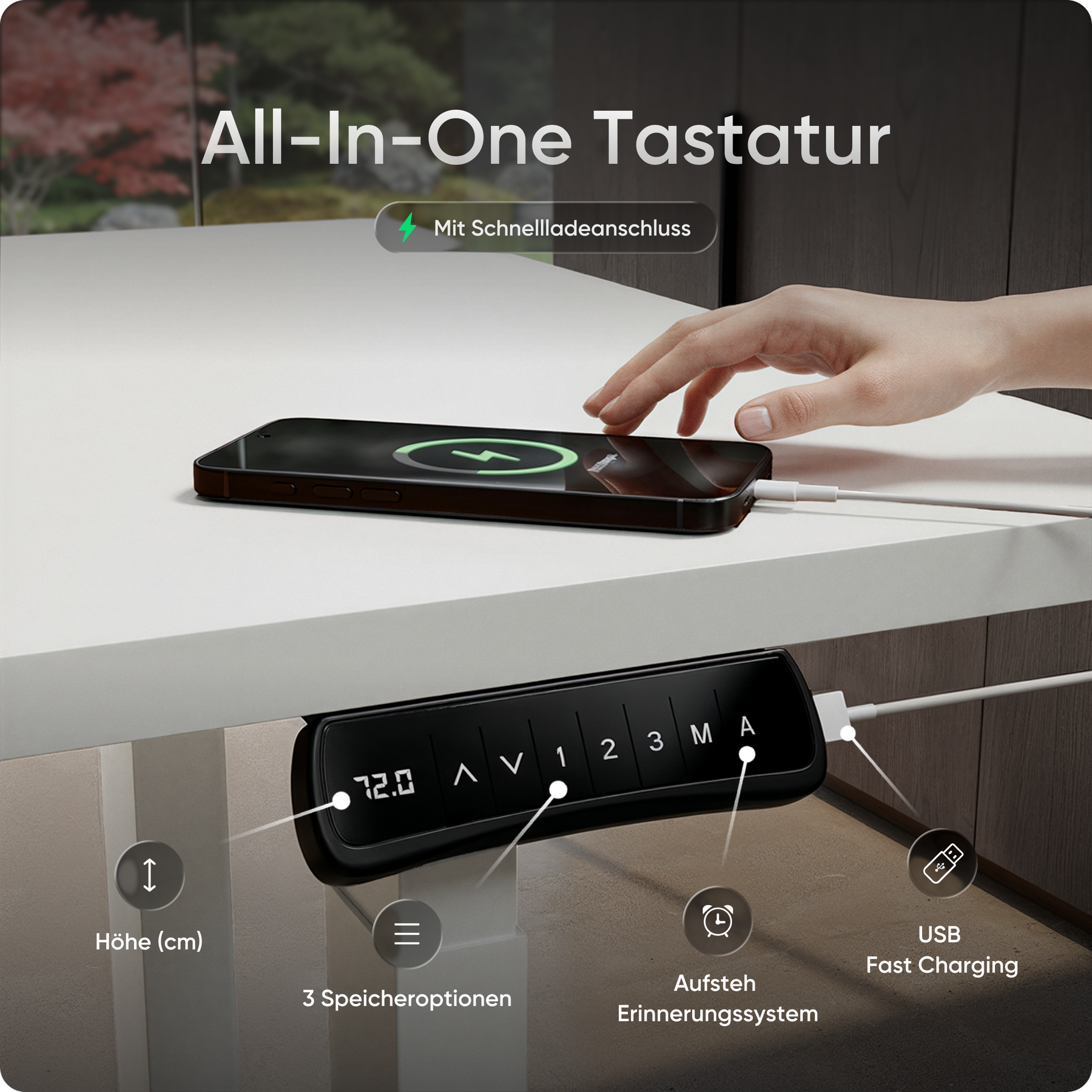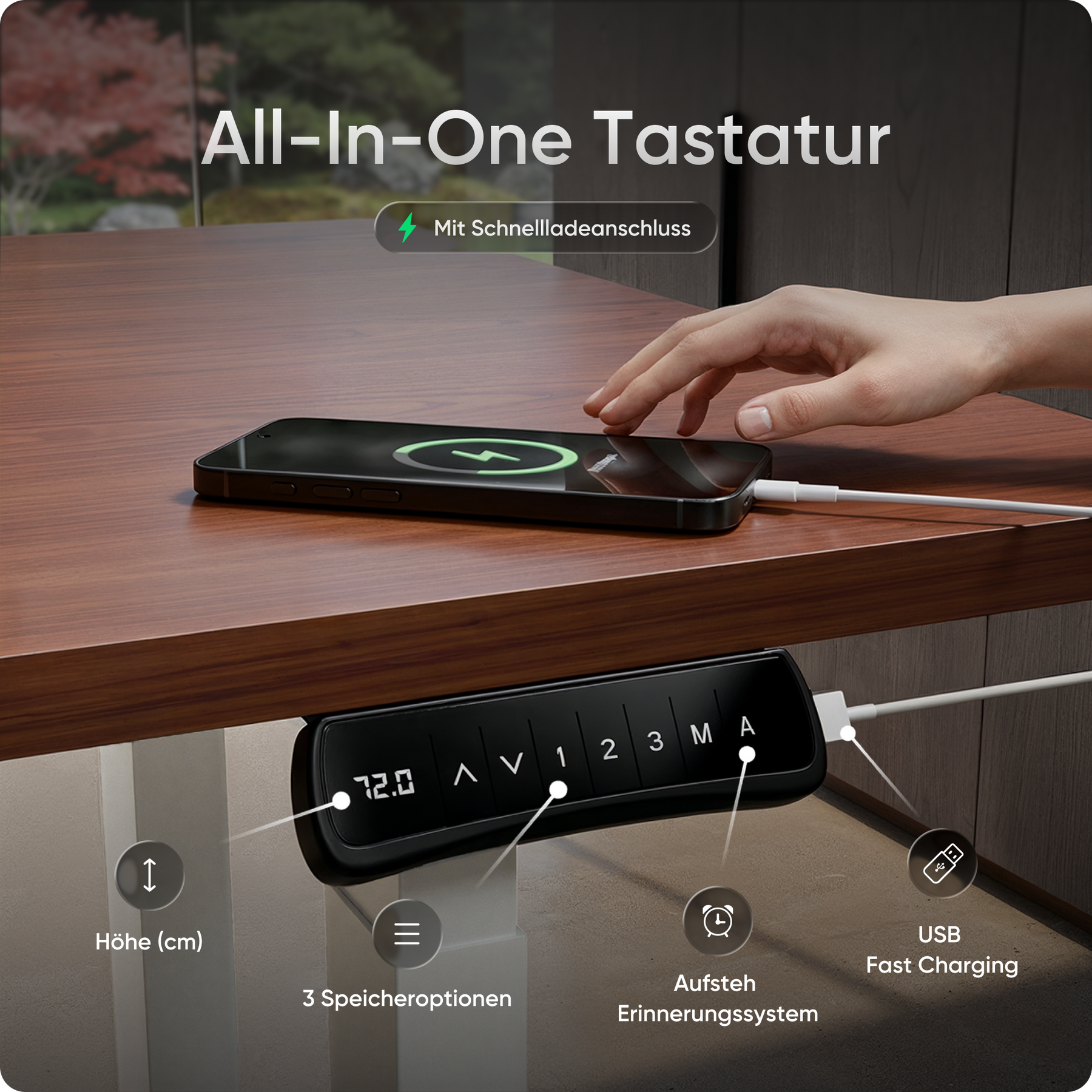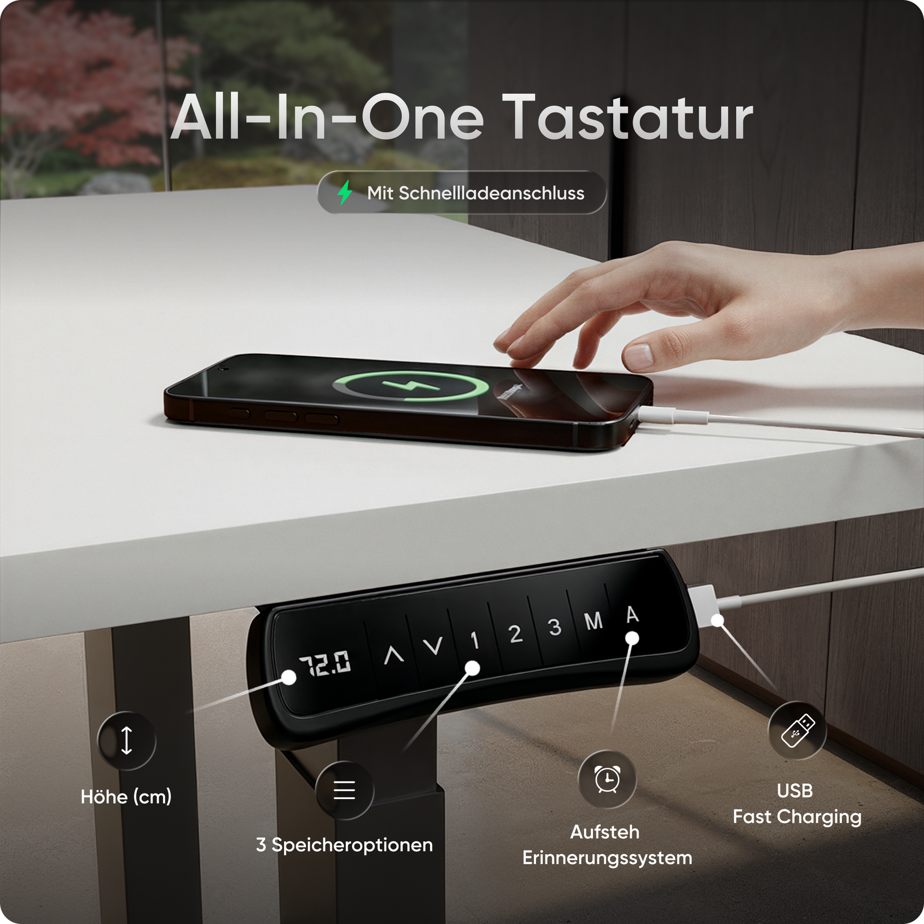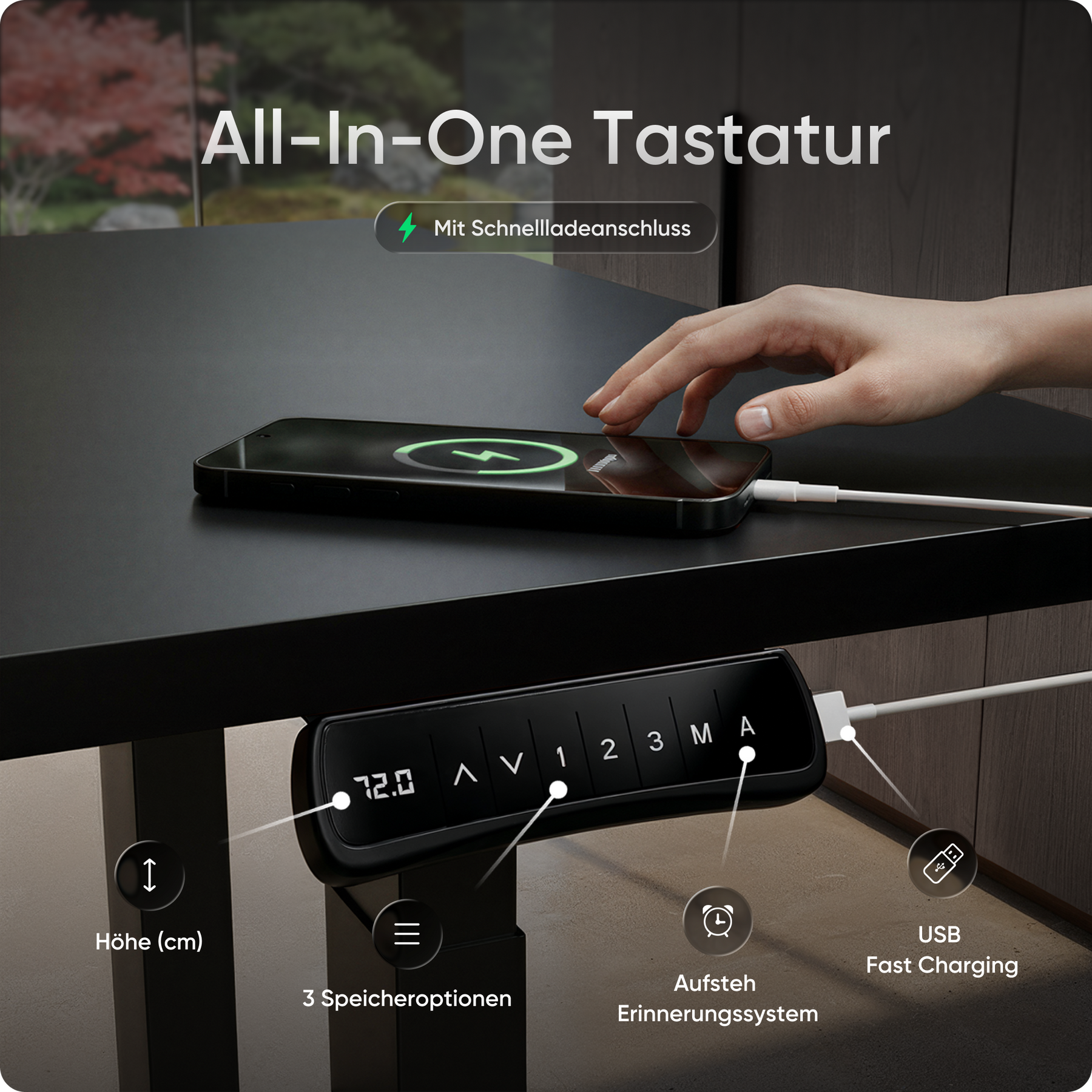 Speichere bis zu drei bevorzugte Höhen und wechsle per Knopfdruck zwischen Sitz- und Stehposition. Ein integrierter Timer erinnert dich auf Wunsch an den nächsten Wechsel. Zusätzlich hält der USB-Schnellladeanschluss deine Geräte jederzeit einsatzbereit.
