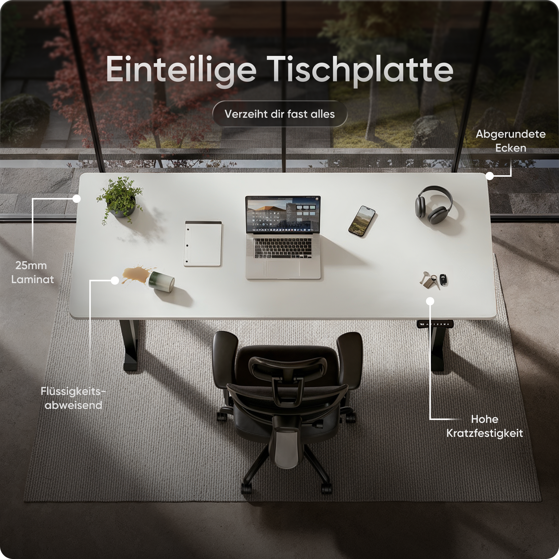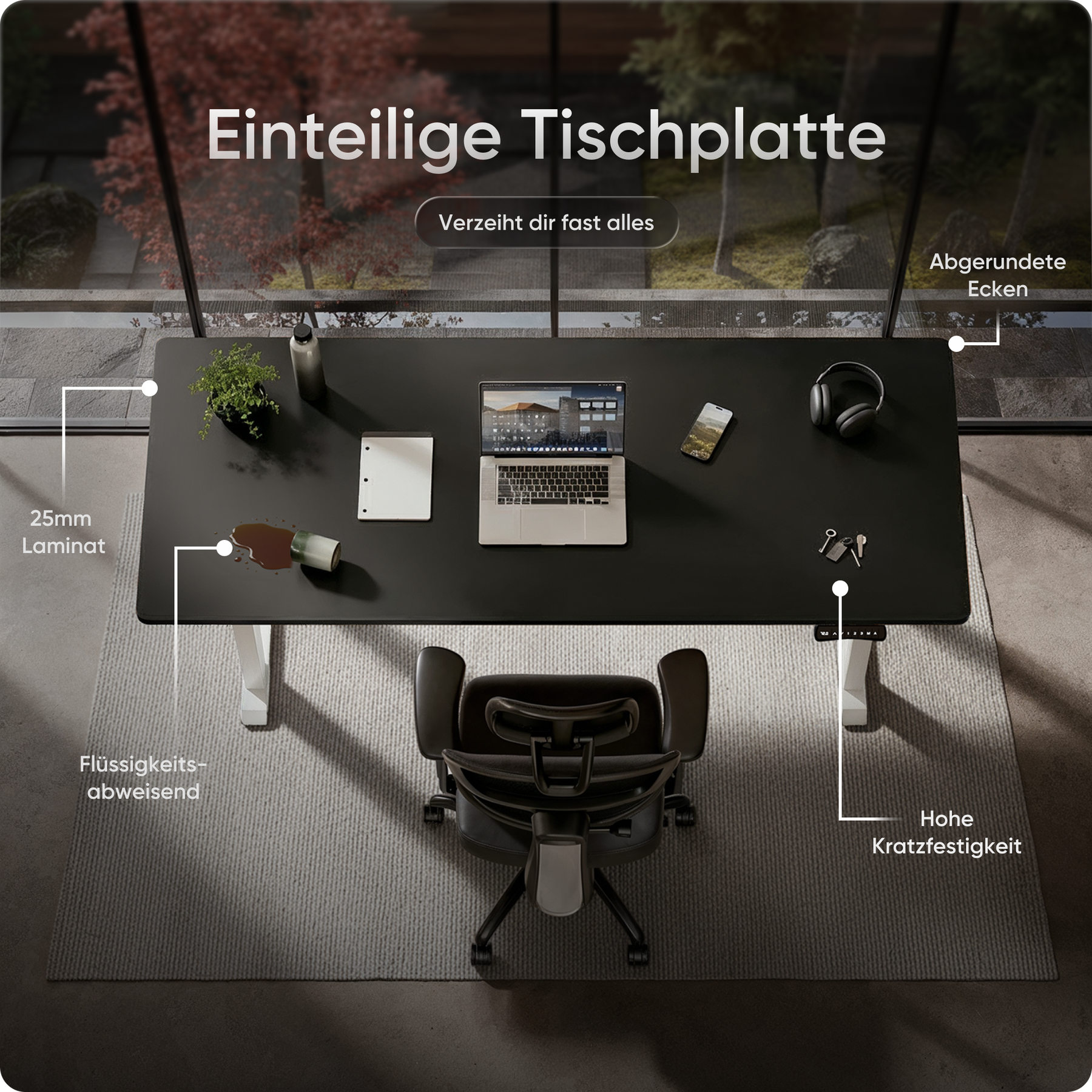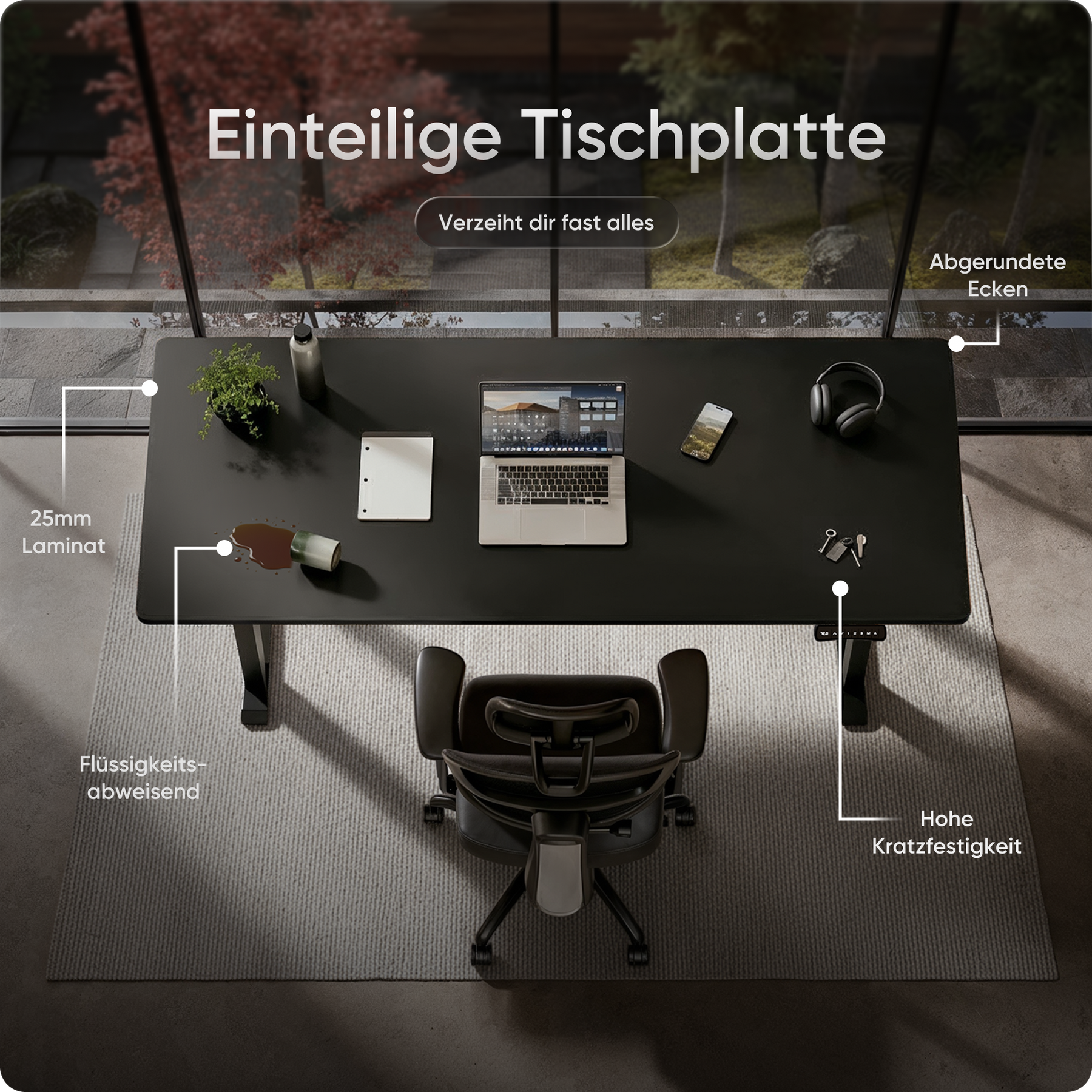 Die Tischplatten bestehen aus emissionsarmen Materialien und sind besonders umweltfreundlich. Ihre kratz- und wasserfeste Oberfläche schützt zuverlässig im Alltag und lässt sich mit einem Wisch mühelos reinigen – ideal für produktives Arbeiten ohne Aufwand.