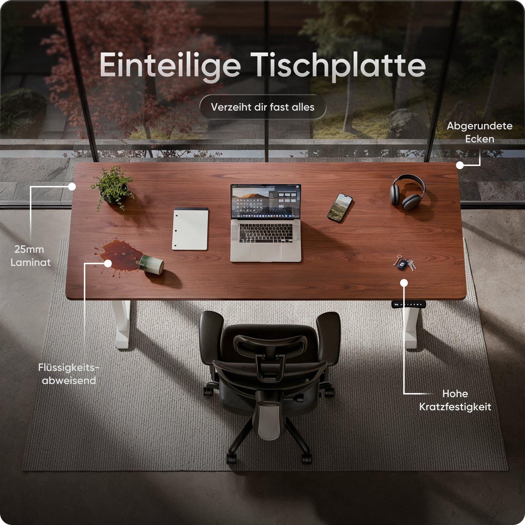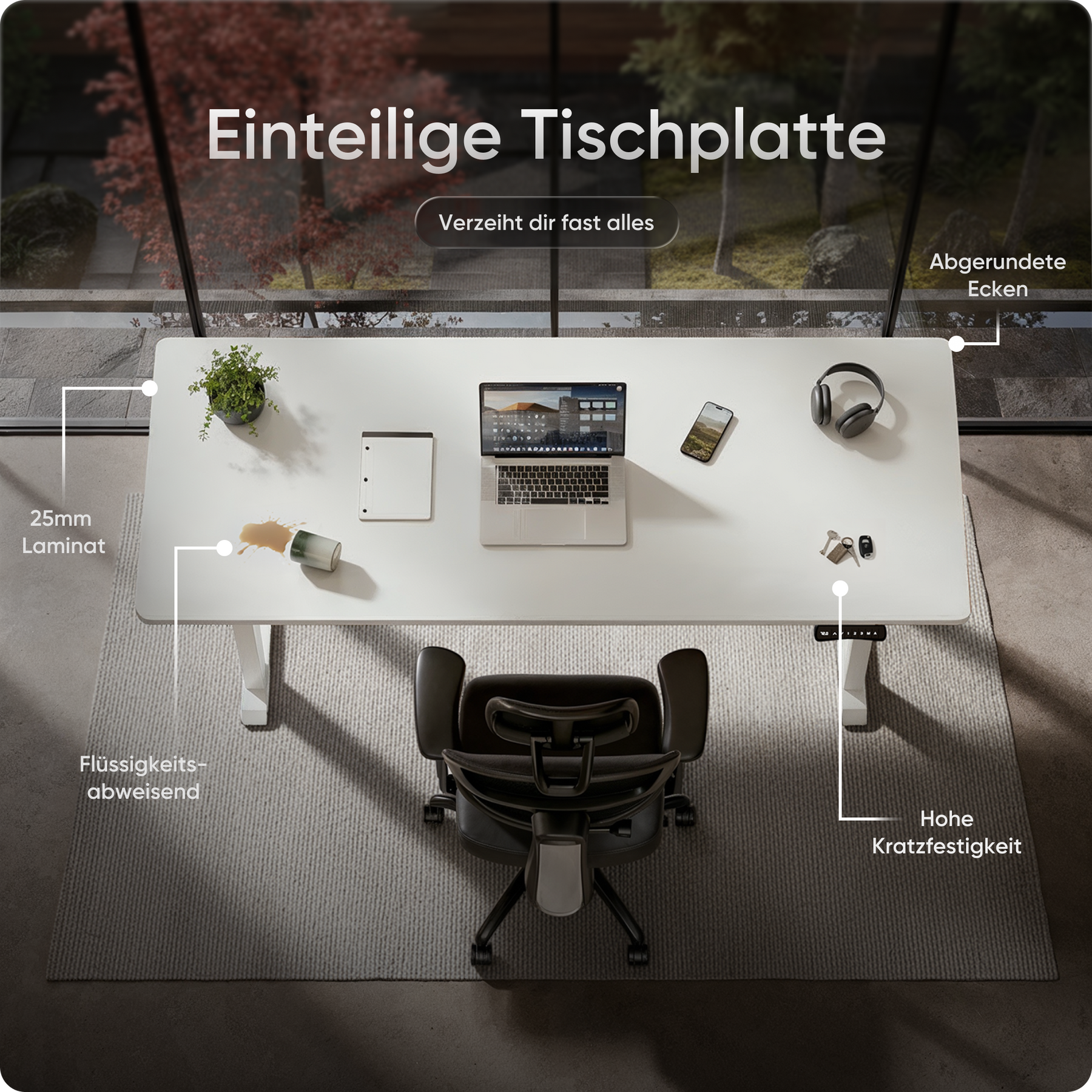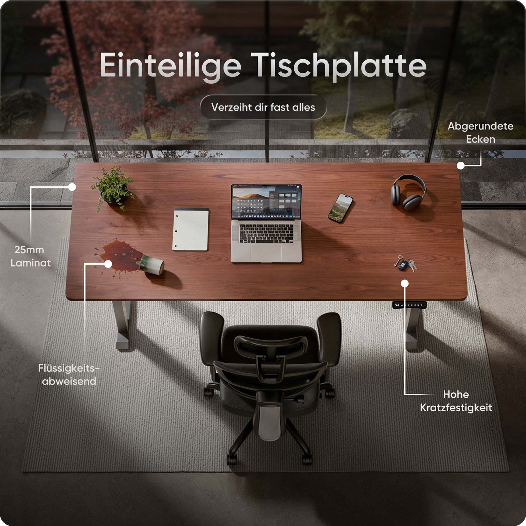 Die Tischplatten bestehen aus emissionsarmen Materialien und sind besonders umweltfreundlich. Ihre kratz- und wasserfeste Oberfläche schützt zuverlässig im Alltag und lässt sich mit einem Wisch mühelos reinigen – ideal für produktives Arbeiten ohne Aufwand.