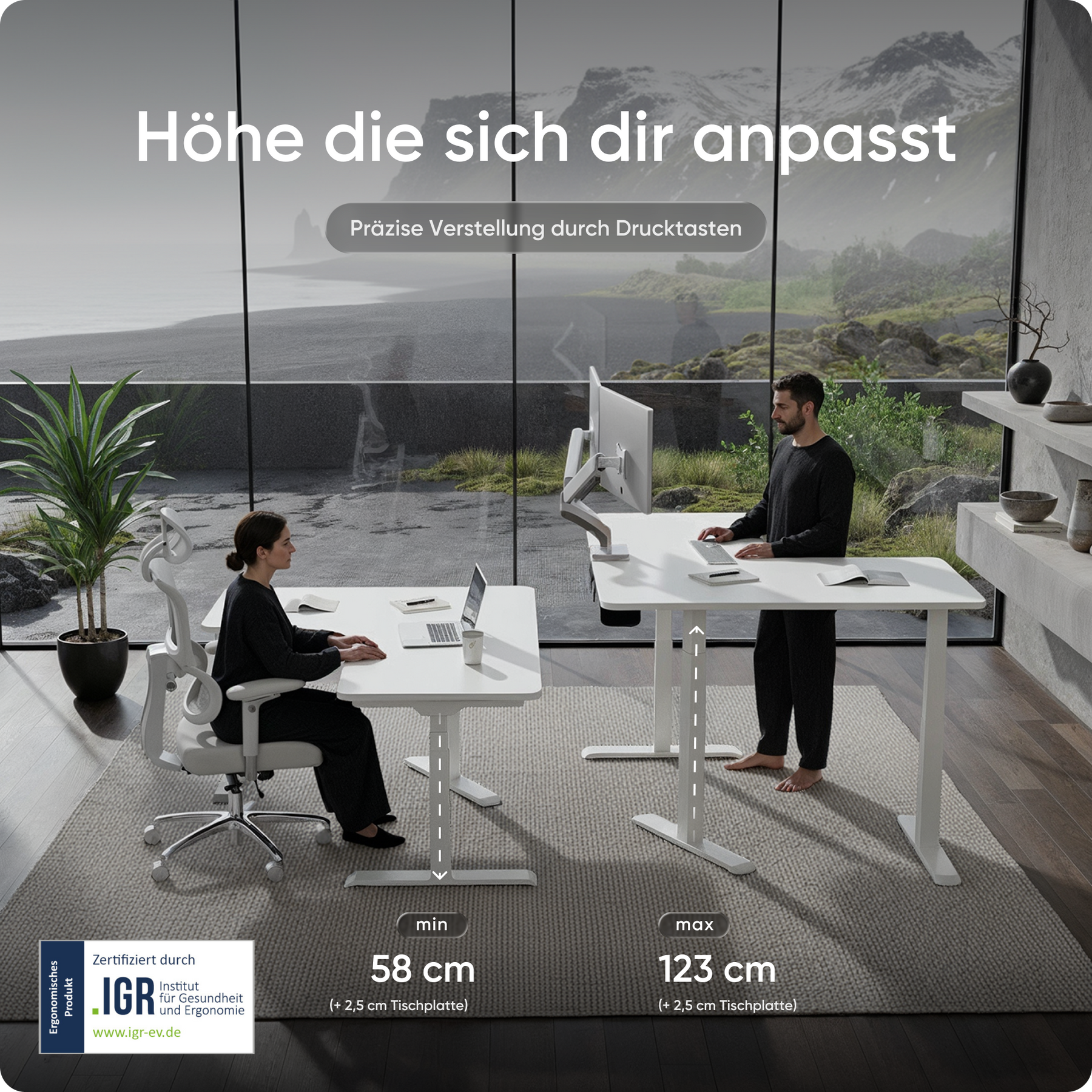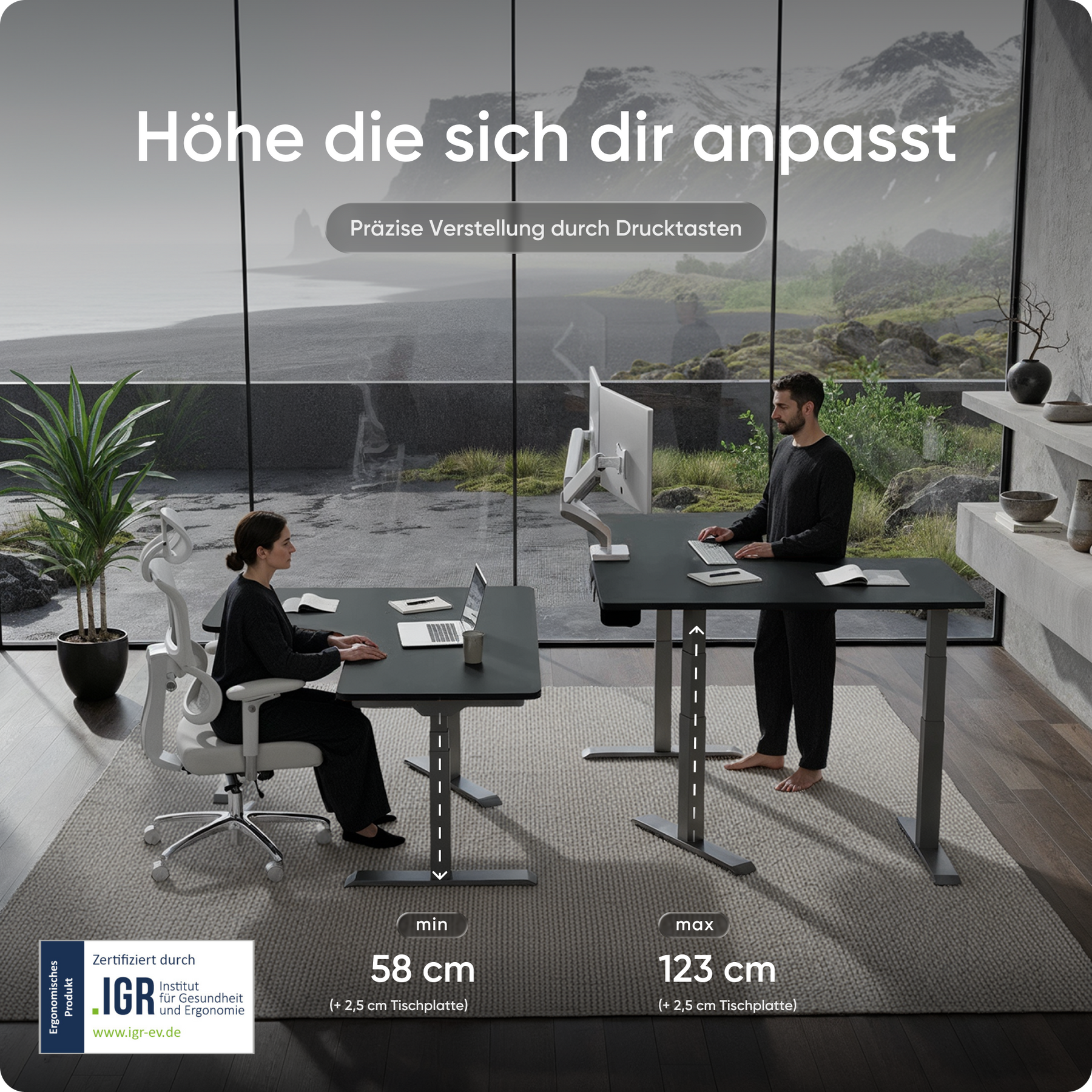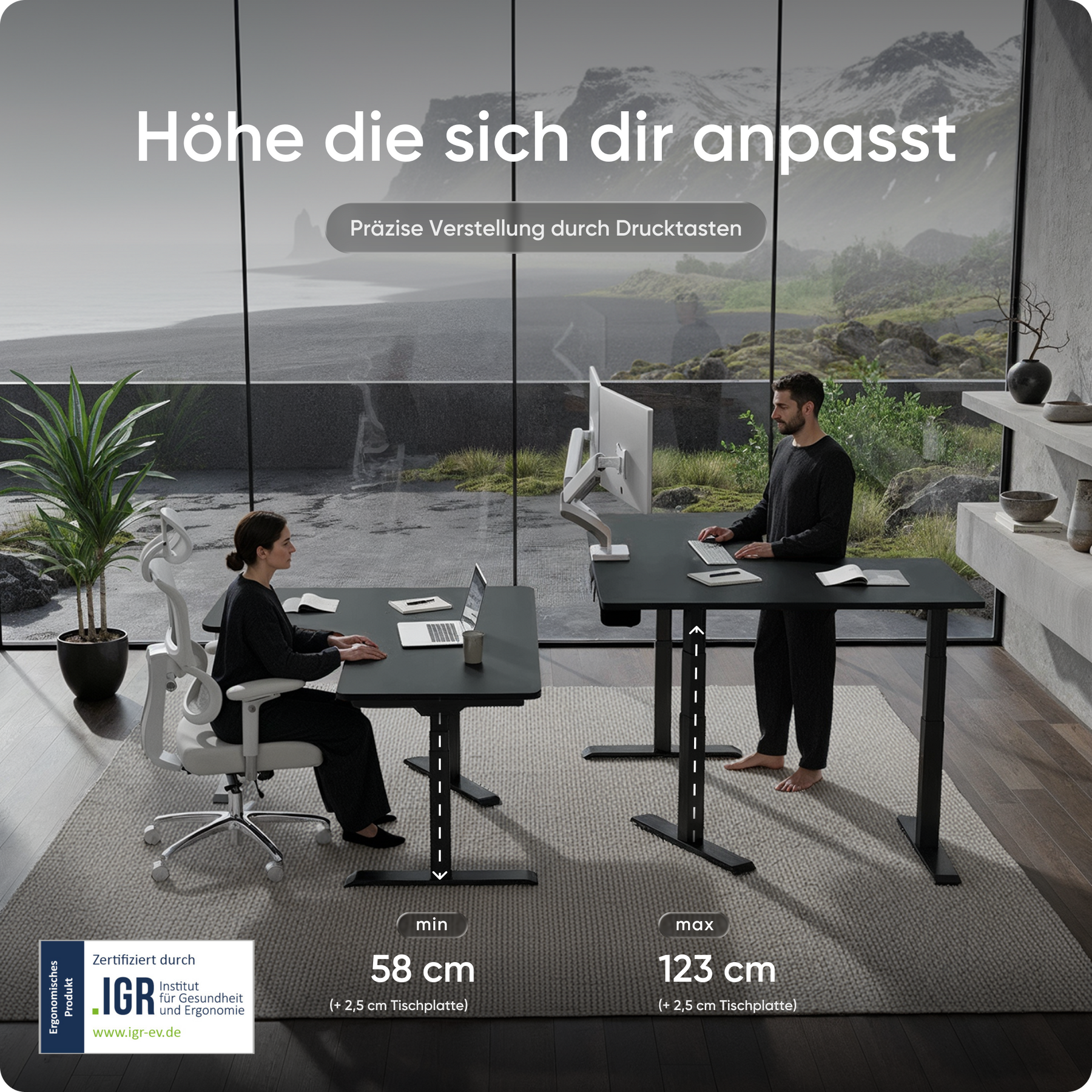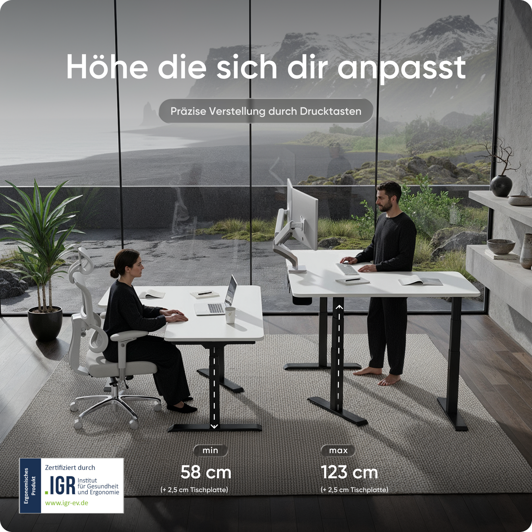 Mit einer Verstellhöhe von 58 bis 123 cm passt sich der Tisch ideal an jede Körpergröße an – von 1,50 bis über 2 Meter. Die leistungsstarken Motoren heben die Platte mit 38 mm pro Sekunde, 4x so schnell wie herkömmliche Modelle. Belastbar bis 150 kg und über 35.000-fach getestet.