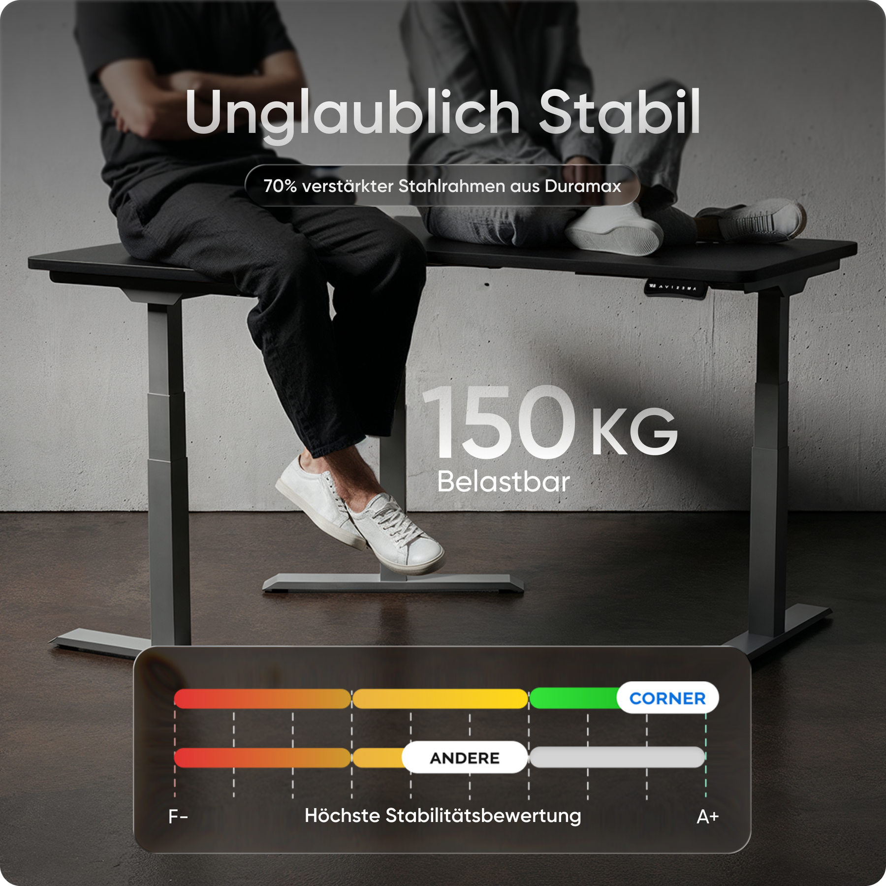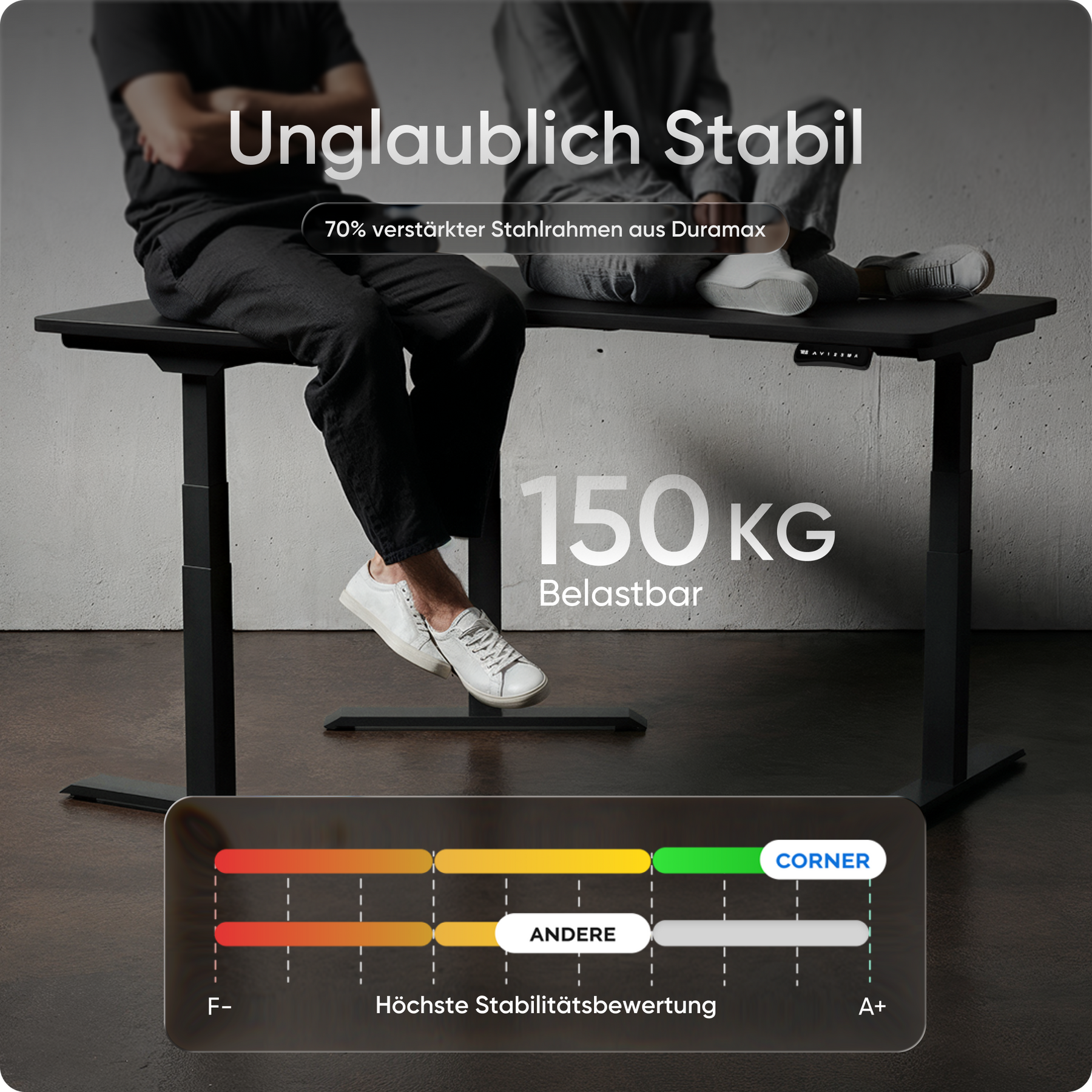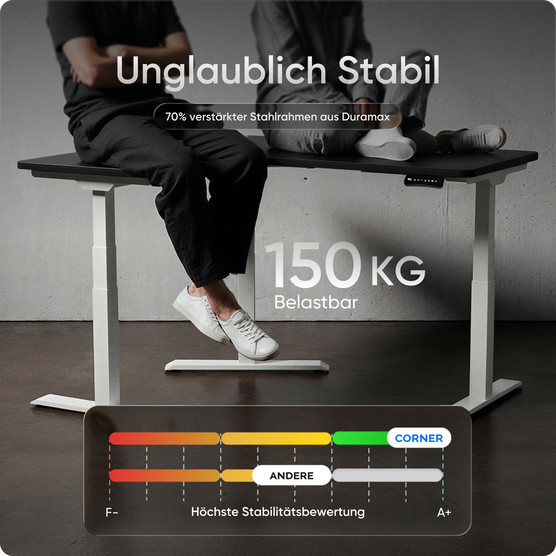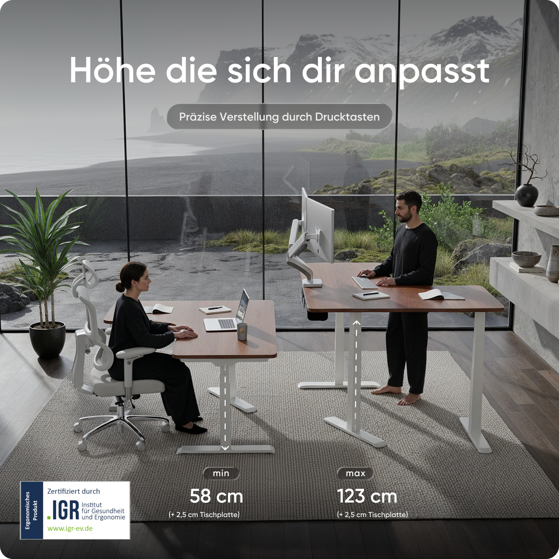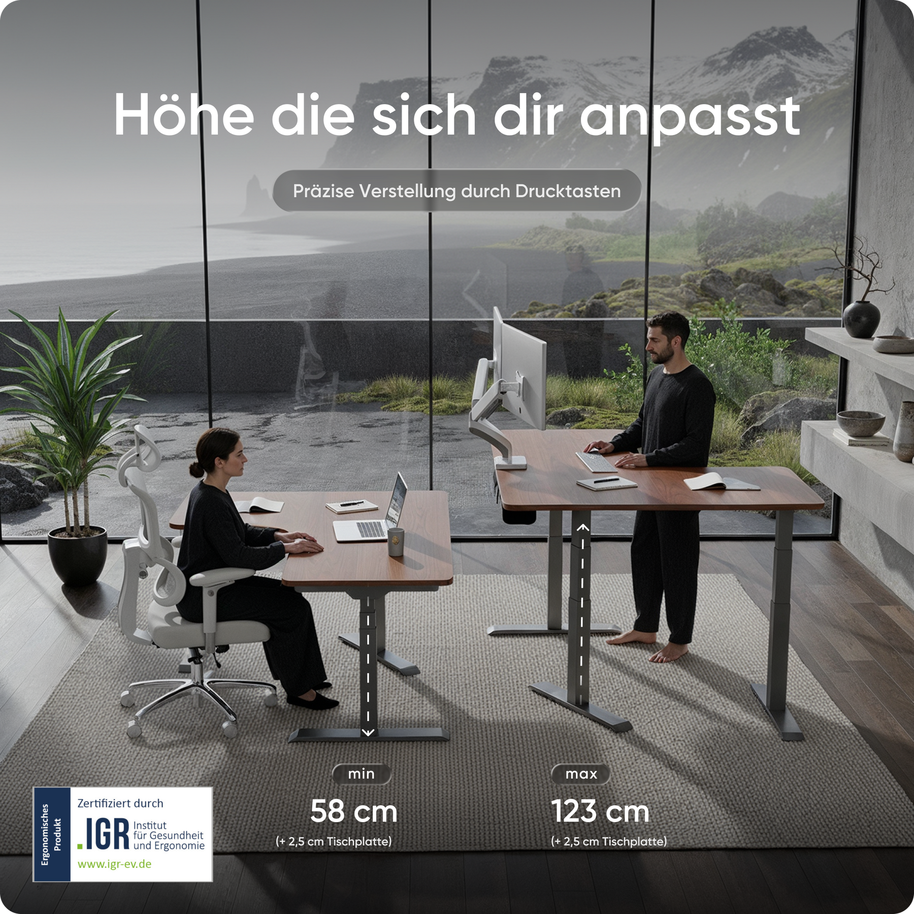 Mit einer Verstellhöhe von 58 bis 123 cm passt sich der Tisch ideal an jede Körpergröße an – von 1,50 bis über 2 Meter. Die leistungsstarken Motoren heben die Platte mit 38 mm pro Sekunde, 4x so schnell wie herkömmliche Modelle. Belastbar bis 150 kg und über 35.000-fach getestet.