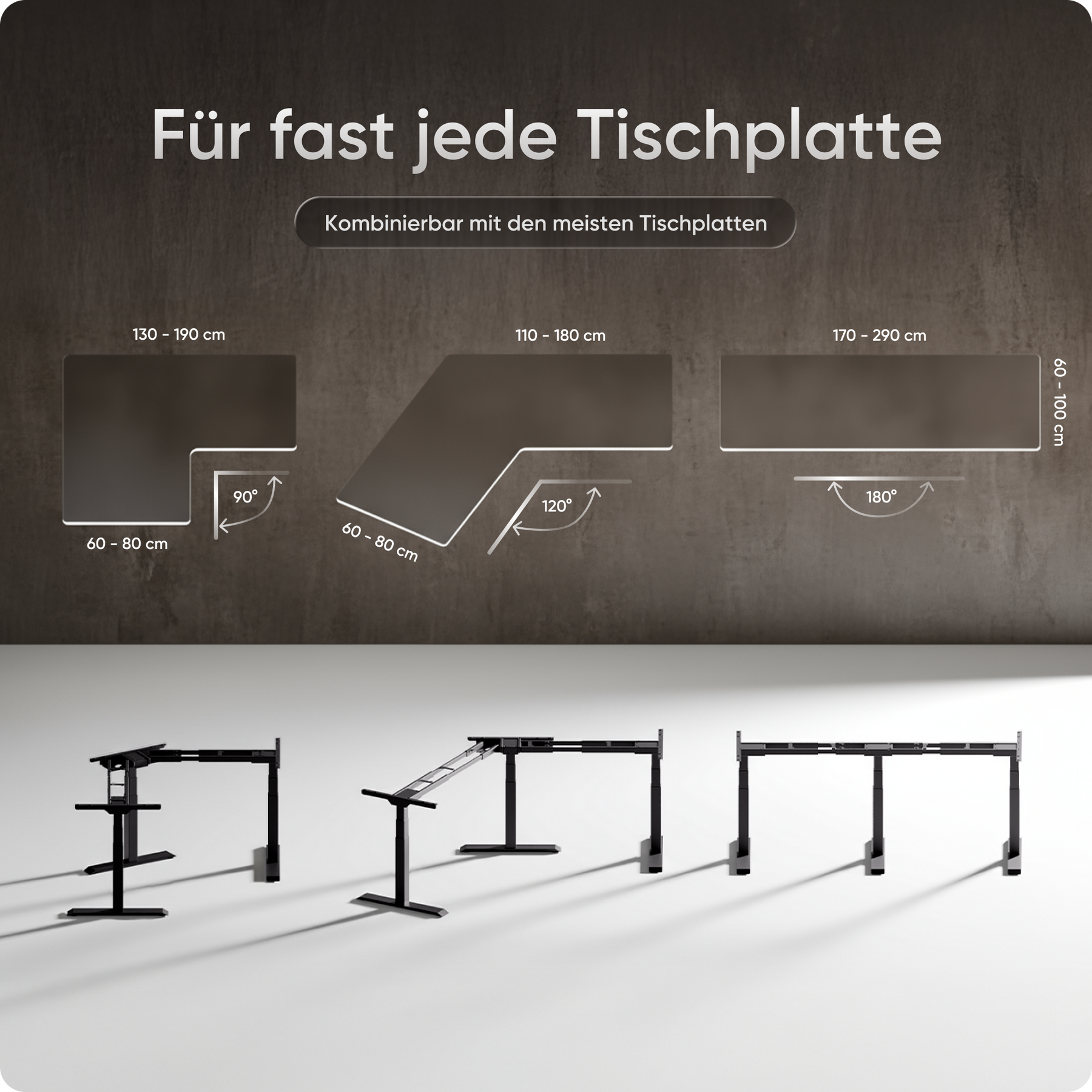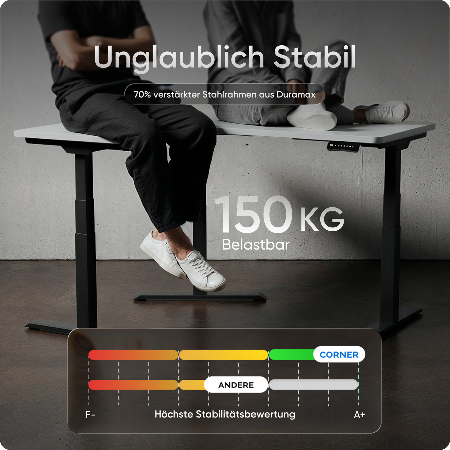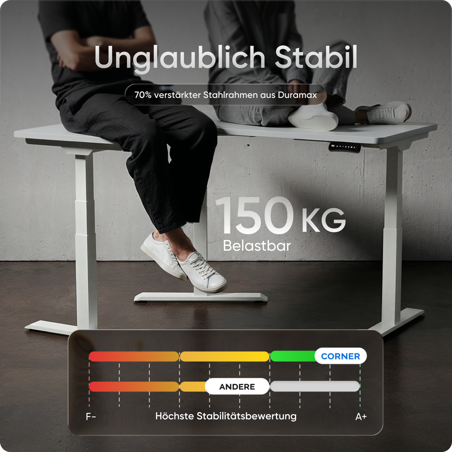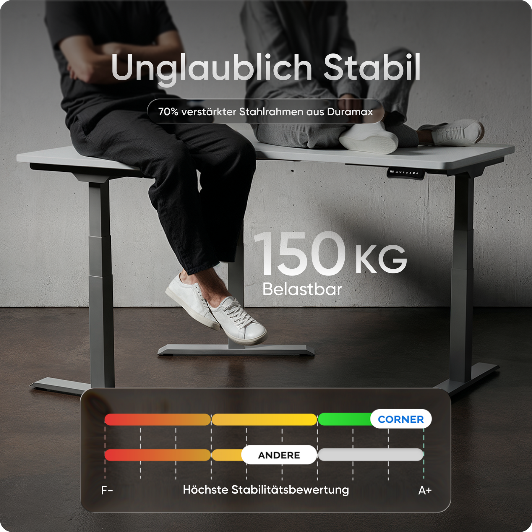 Mit einer Verstellhöhe von 58 bis 123 cm passt sich der Tisch ideal an jede Körpergröße an – von 1,50 bis über 2 Meter. Die leistungsstarken Motoren heben die Platte mit 38 mm pro Sekunde, 4x so schnell wie herkömmliche Modelle. Belastbar bis 150 kg und über 35.000-fach getestet.