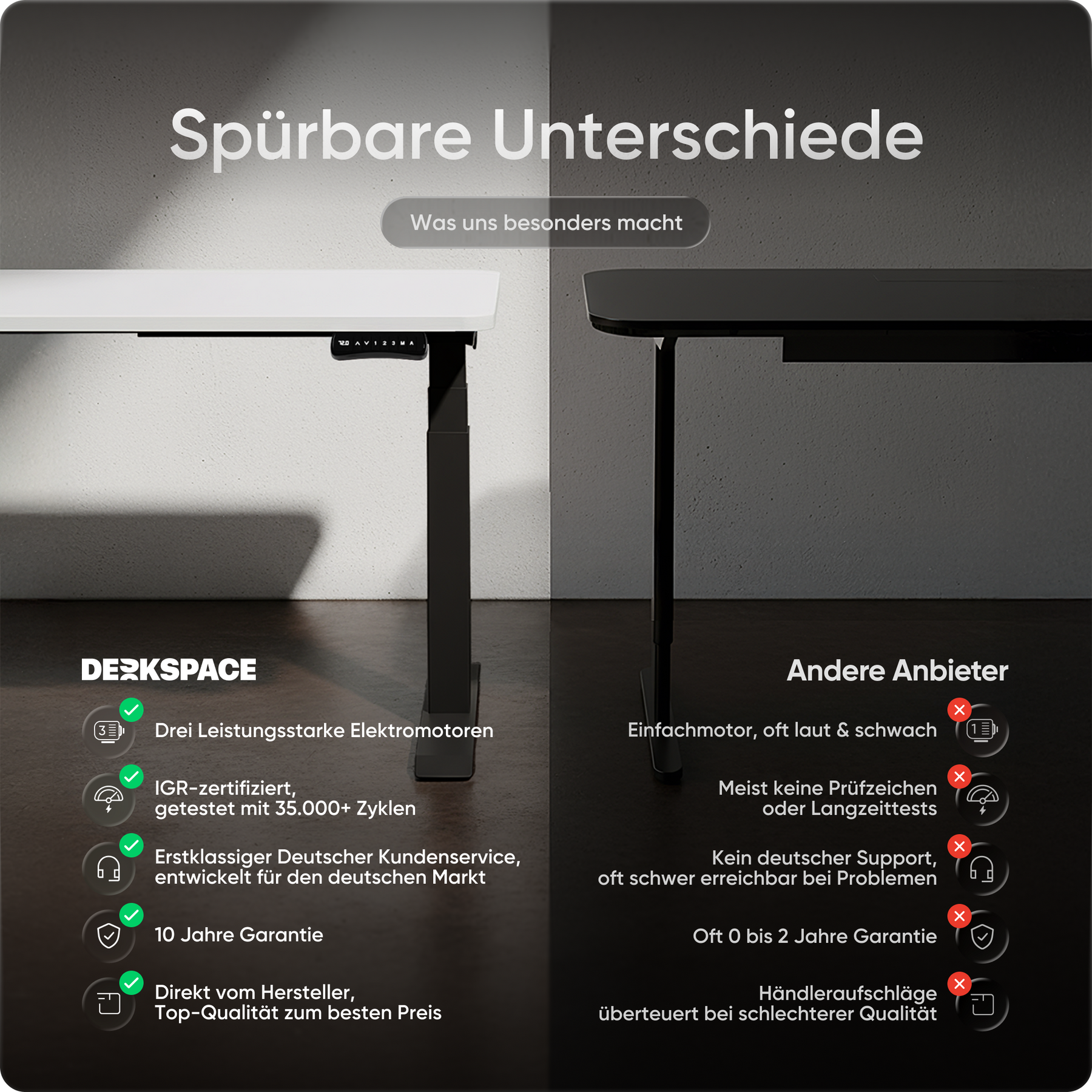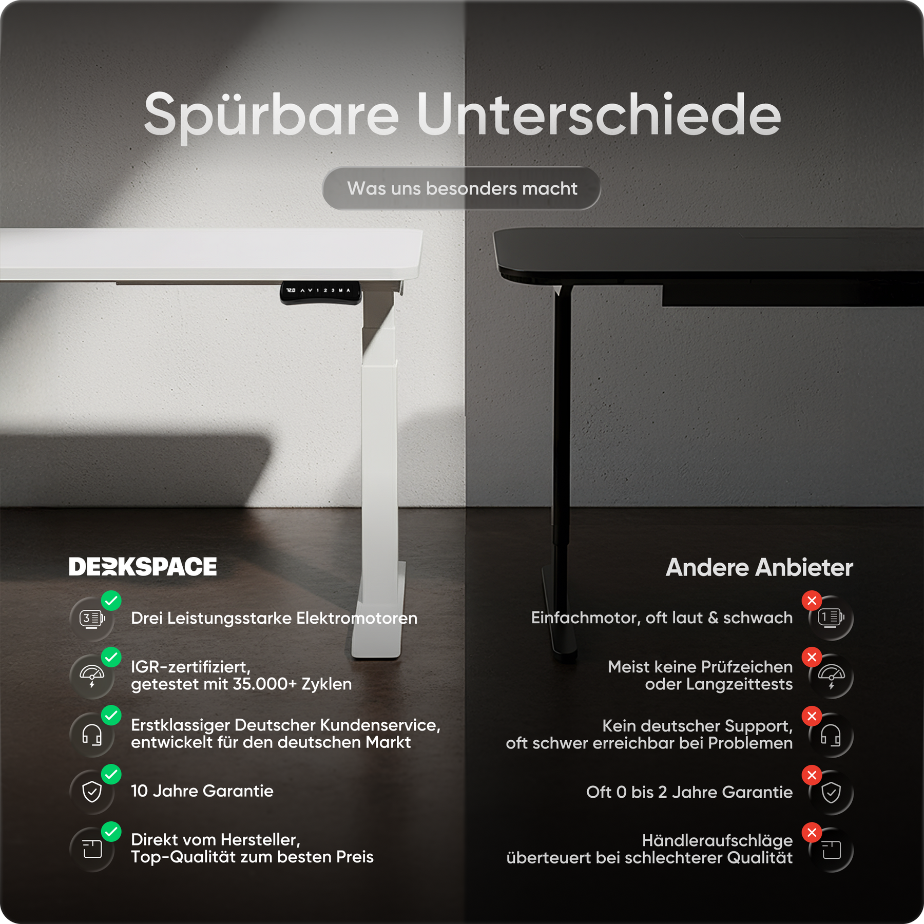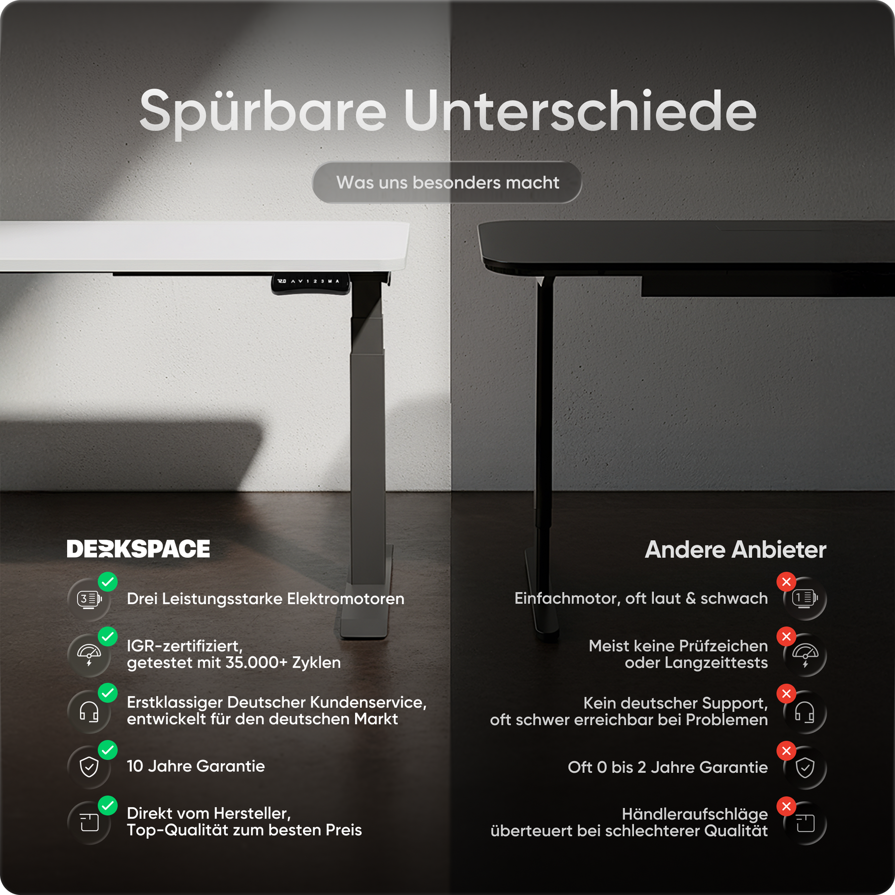 Bij DESKSPACE zetten we in op de hoogste kwaliteitsstandaarden, zonder de hoge prijs. Onze elektrisch in hoogte verstelbare bureaus staan voor uitstekende kwaliteit, onovertroffen stabiliteit en ongeëvenaarde klanttevredenheid. Terwijl andere merken op kwaliteit besparen of de prijzen opblazen, bieden wij de beste prijs-kwaliteitverhouding op de markt. Met tot 10 jaar garantie, 100 dagen gratis proefperiode en razendsnelle levering in 1-3 dagen is DESKSPACE de slimme en voordelige keuze.