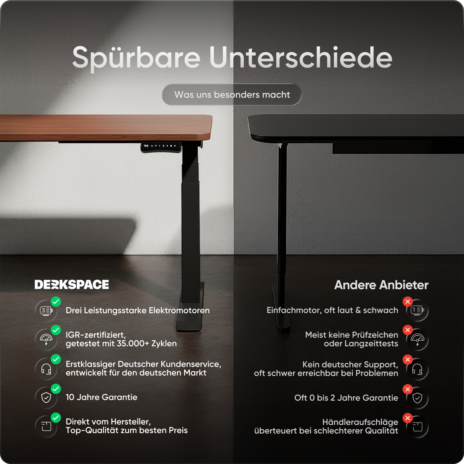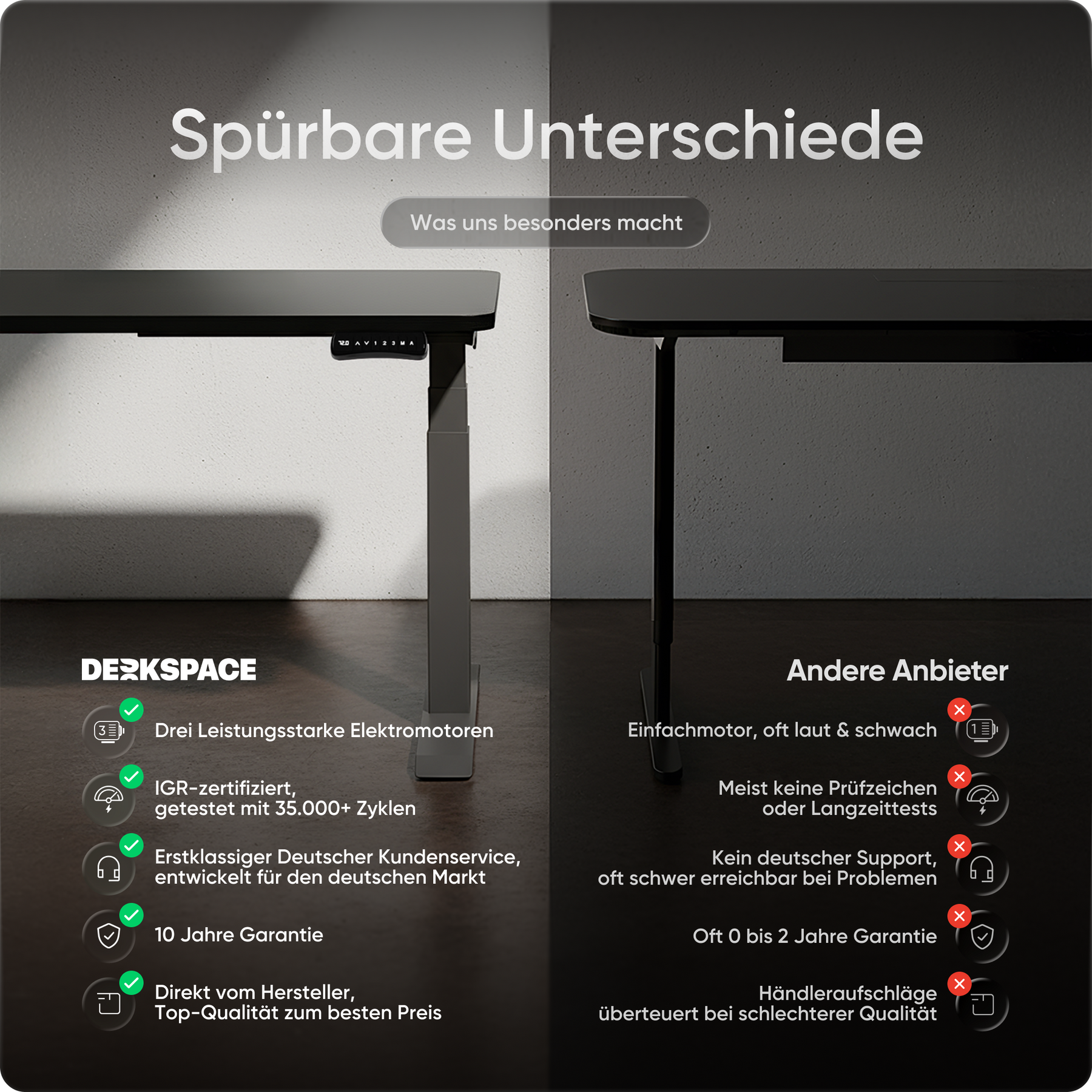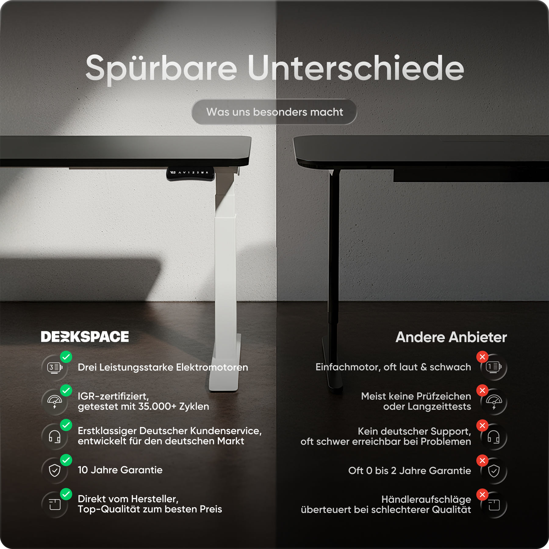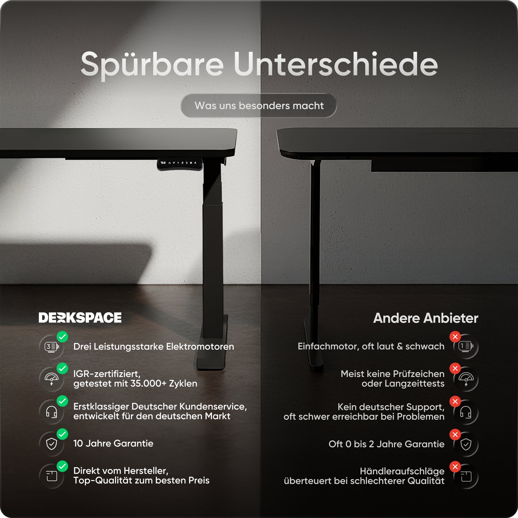 Bij DESKSPACE zetten we in op de hoogste kwaliteitsstandaarden, zonder de hoge prijs. Onze elektrisch in hoogte verstelbare bureaus staan voor uitstekende kwaliteit, onovertroffen stabiliteit en ongeëvenaarde klanttevredenheid. Terwijl andere merken op kwaliteit besparen of de prijzen opblazen, bieden wij de beste prijs-kwaliteitverhouding op de markt. Met tot 10 jaar garantie, 100 dagen gratis proefperiode en razendsnelle levering in 1-3 dagen is DESKSPACE de slimme en voordelige keuze.
