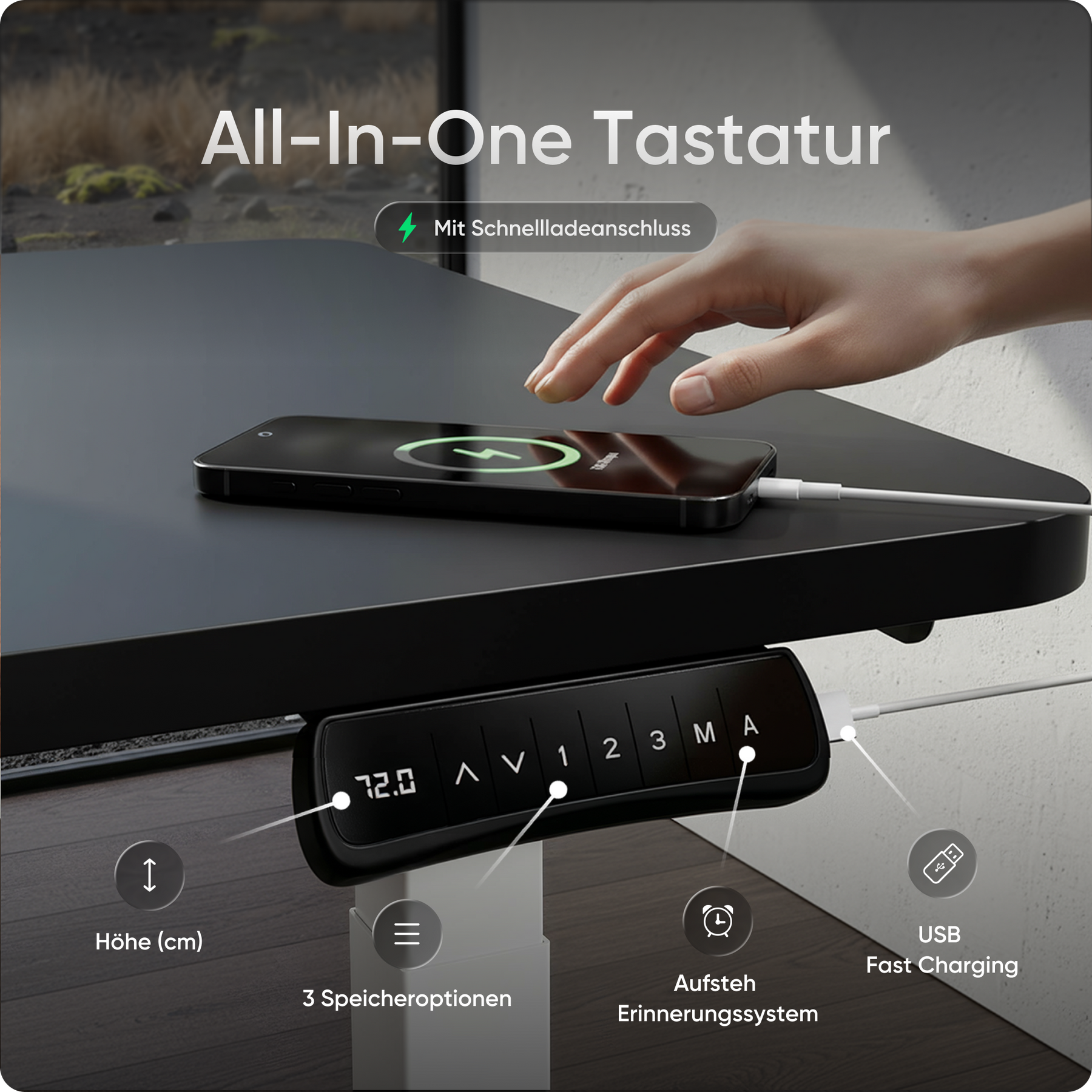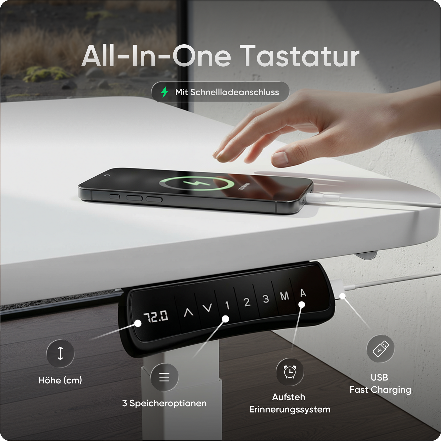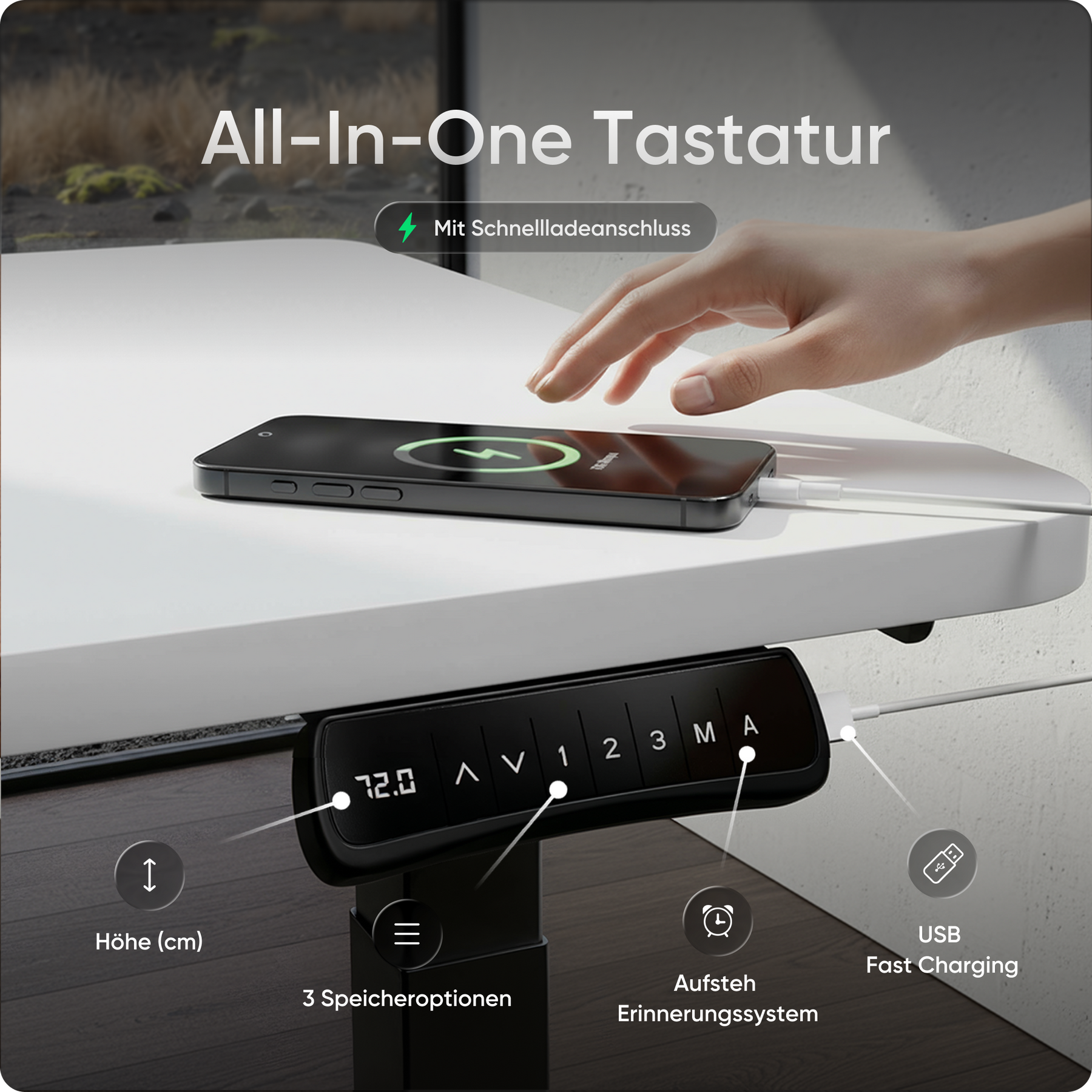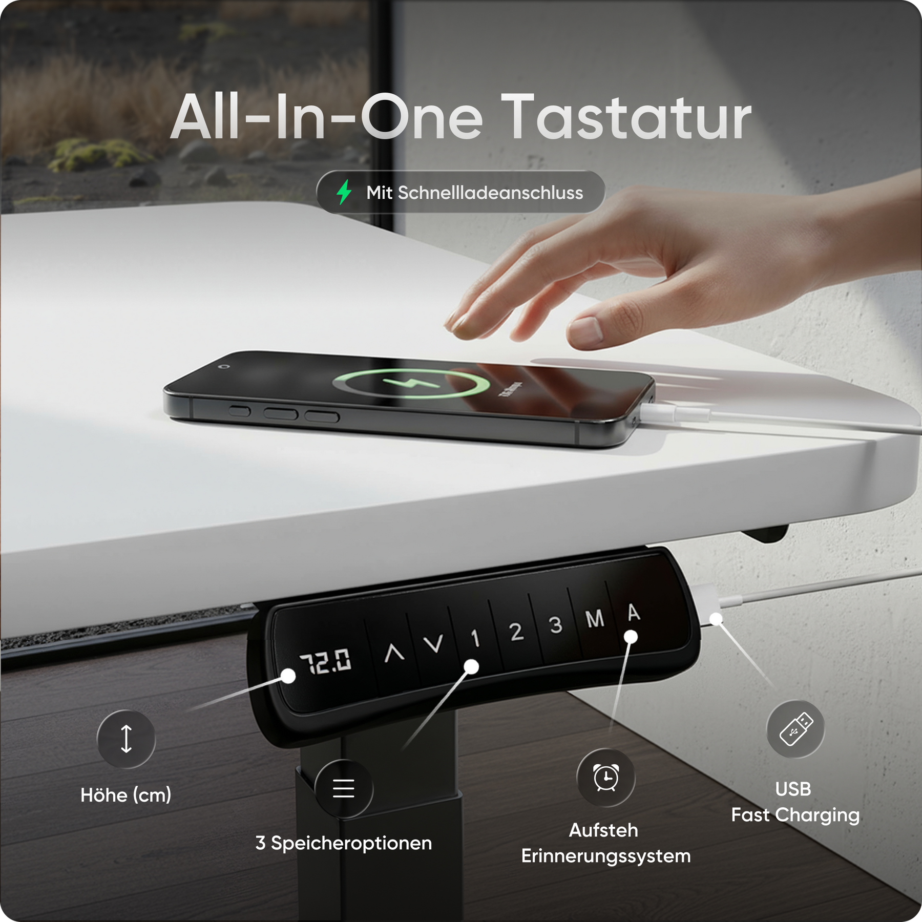Speichere bis zu drei bevorzugte Höhen und wechsle per Knopfdruck zwischen Sitz- und Stehposition. Ein integrierter Timer erinnert dich auf Wunsch an den nächsten Wechsel. Zusätzlich hält der USB-Schnellladeanschluss deine Geräte jederzeit einsatzbereit.