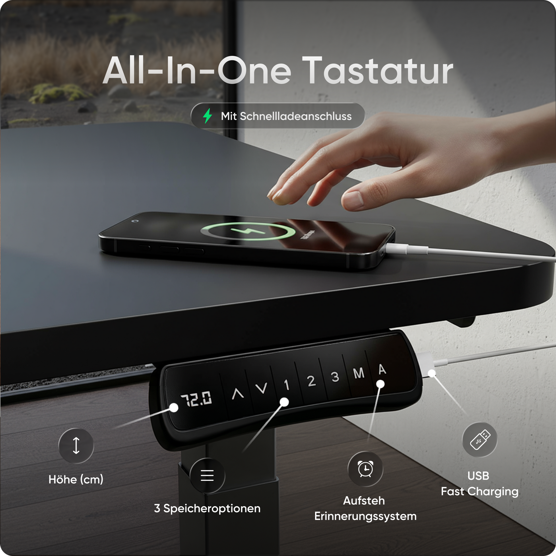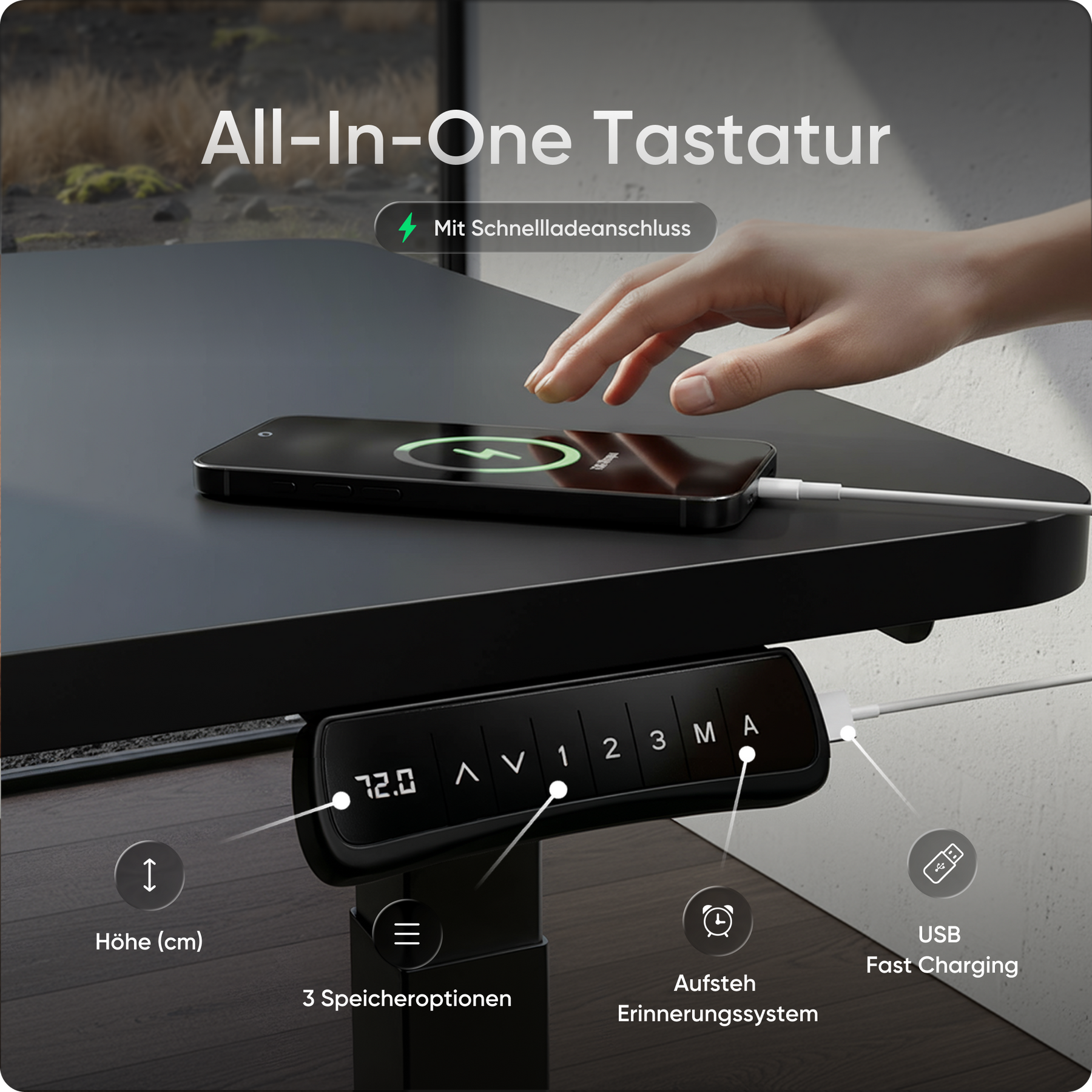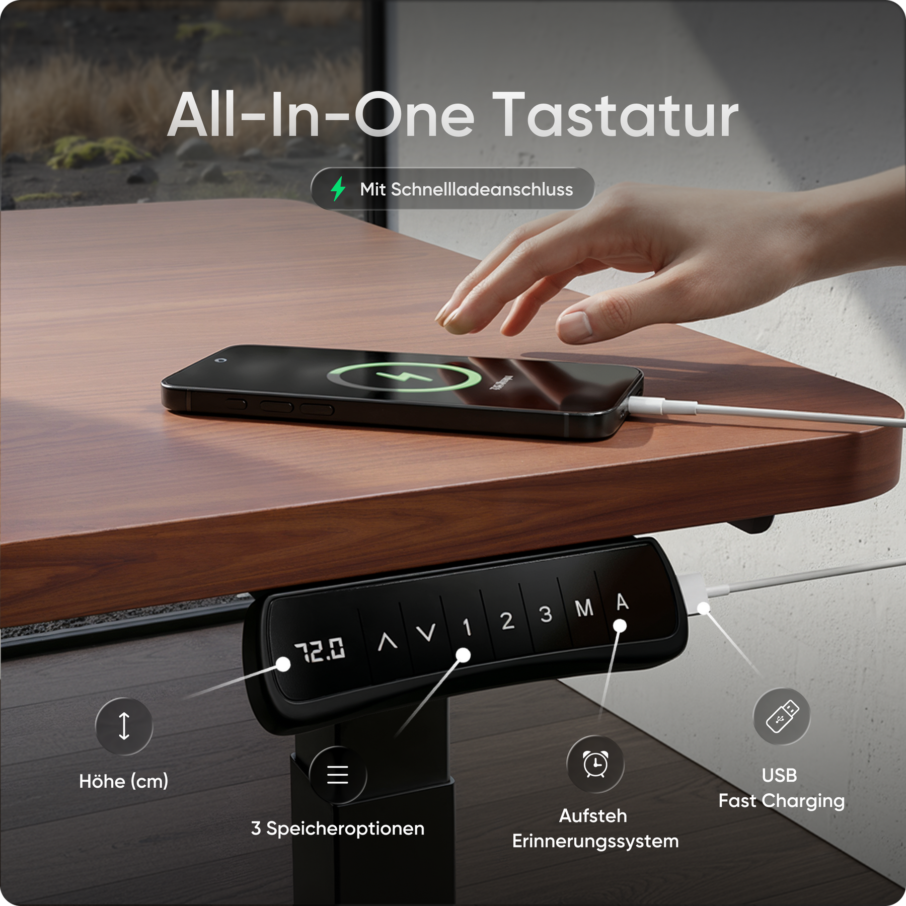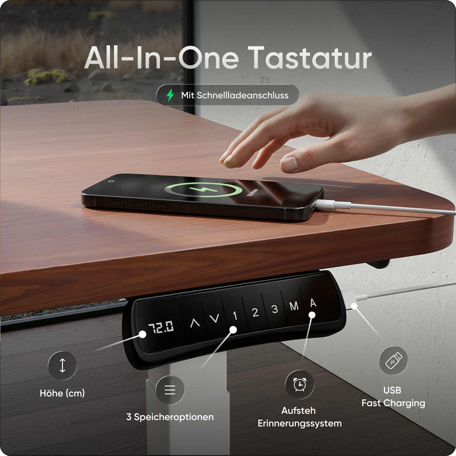 Speichere bis zu drei bevorzugte Höhen und wechsle per Knopfdruck zwischen Sitz- und Stehposition. Ein integrierter Timer erinnert dich auf Wunsch an den nächsten Wechsel. Zusätzlich hält der USB-Schnellladeanschluss deine Geräte jederzeit einsatzbereit.
