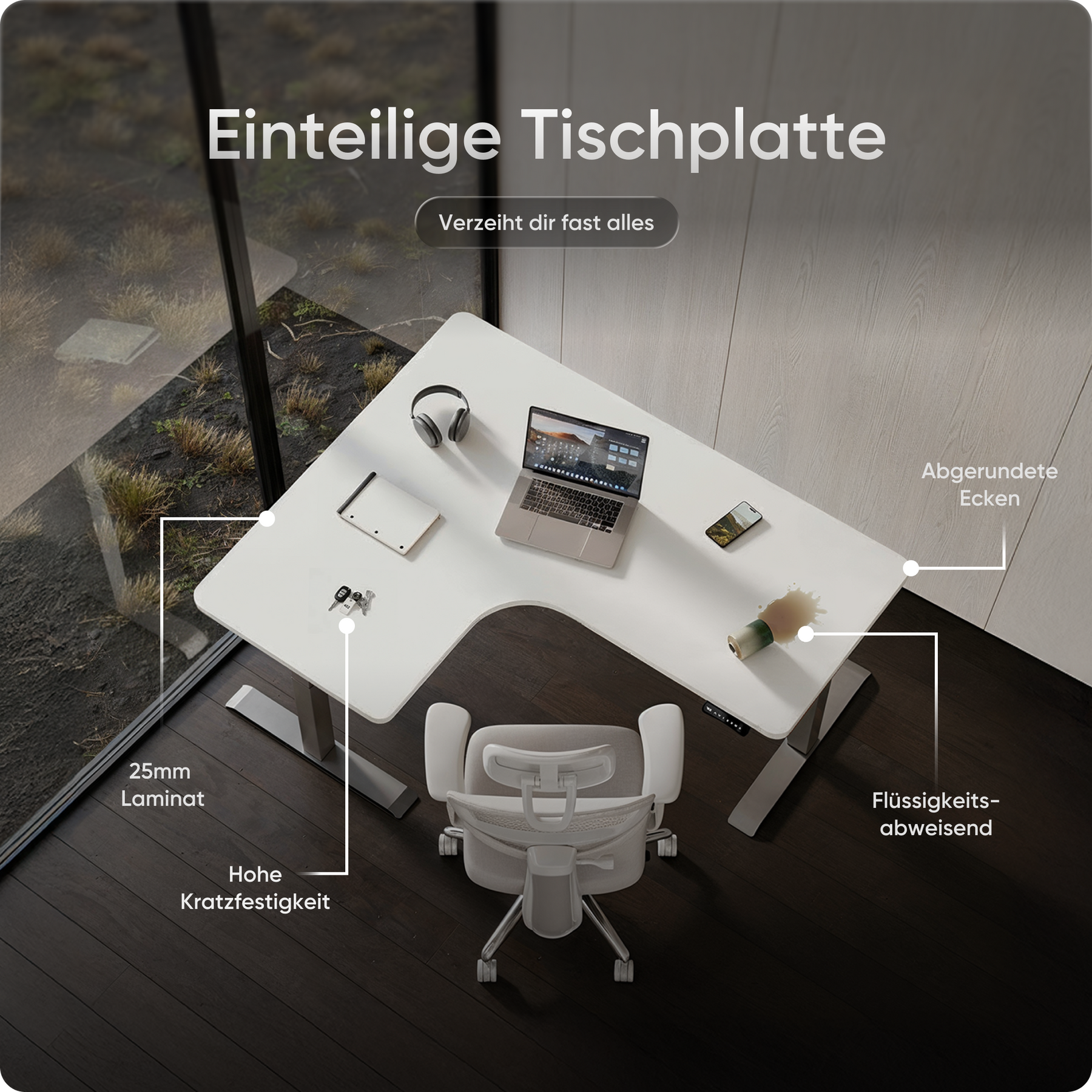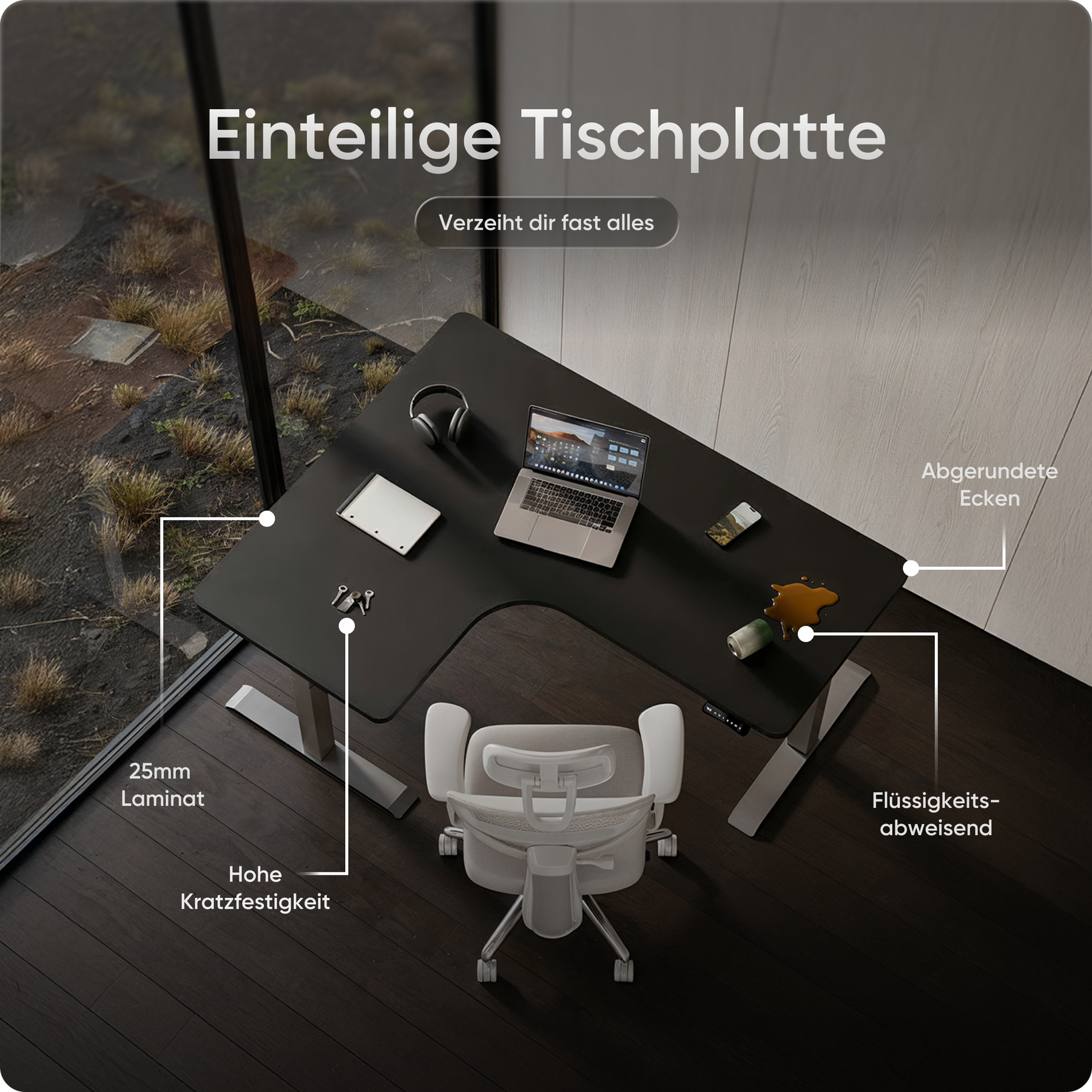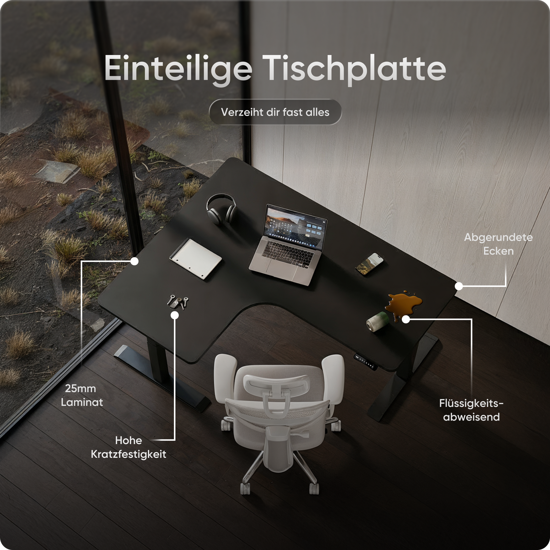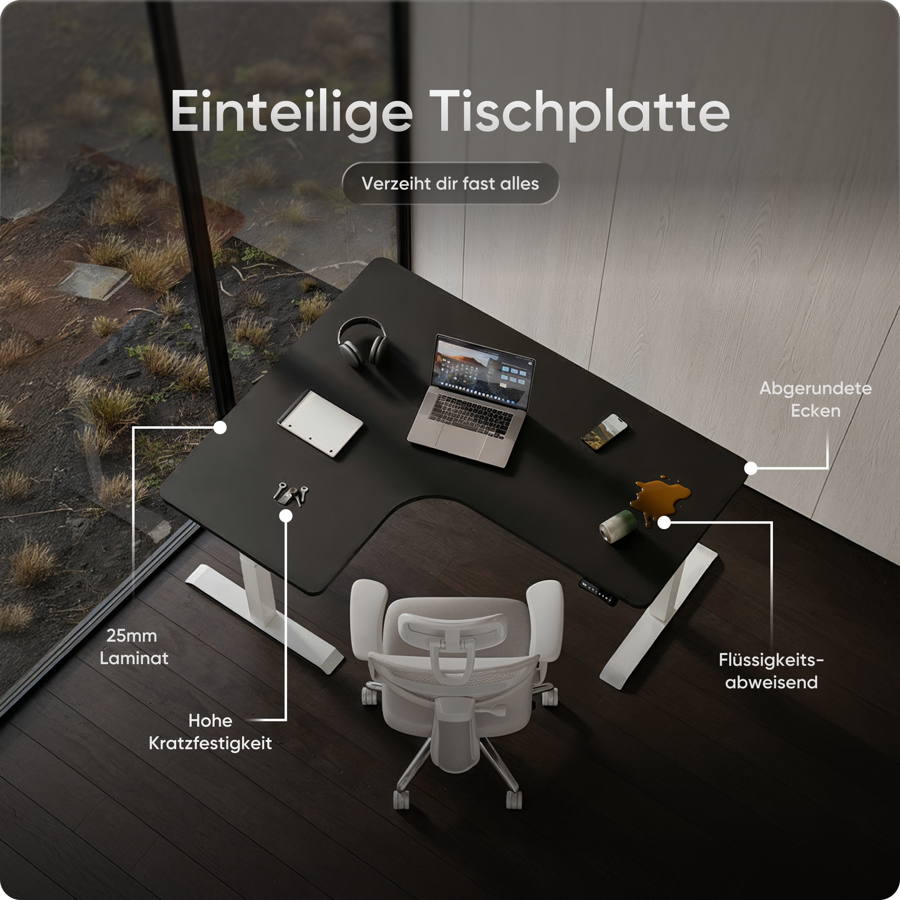 Die Tischplatten bestehen aus emissionsarmen Materialien und sind besonders umweltfreundlich. Ihre kratz- und wasserfeste Oberfläche schützt zuverlässig im Alltag und lässt sich mit einem Wisch mühelos reinigen – ideal für produktives Arbeiten ohne Aufwand.