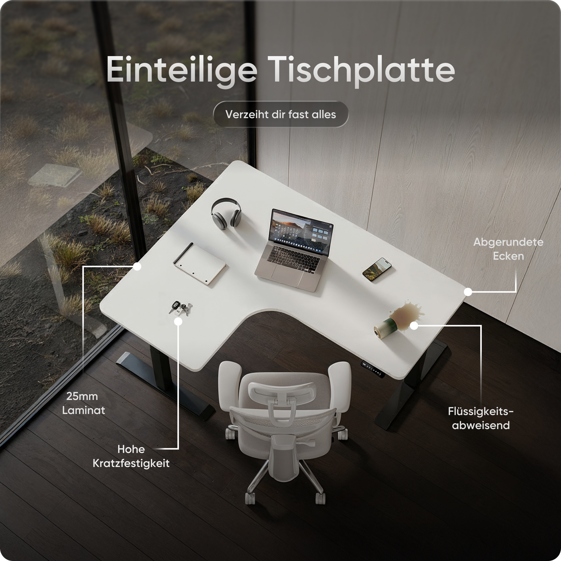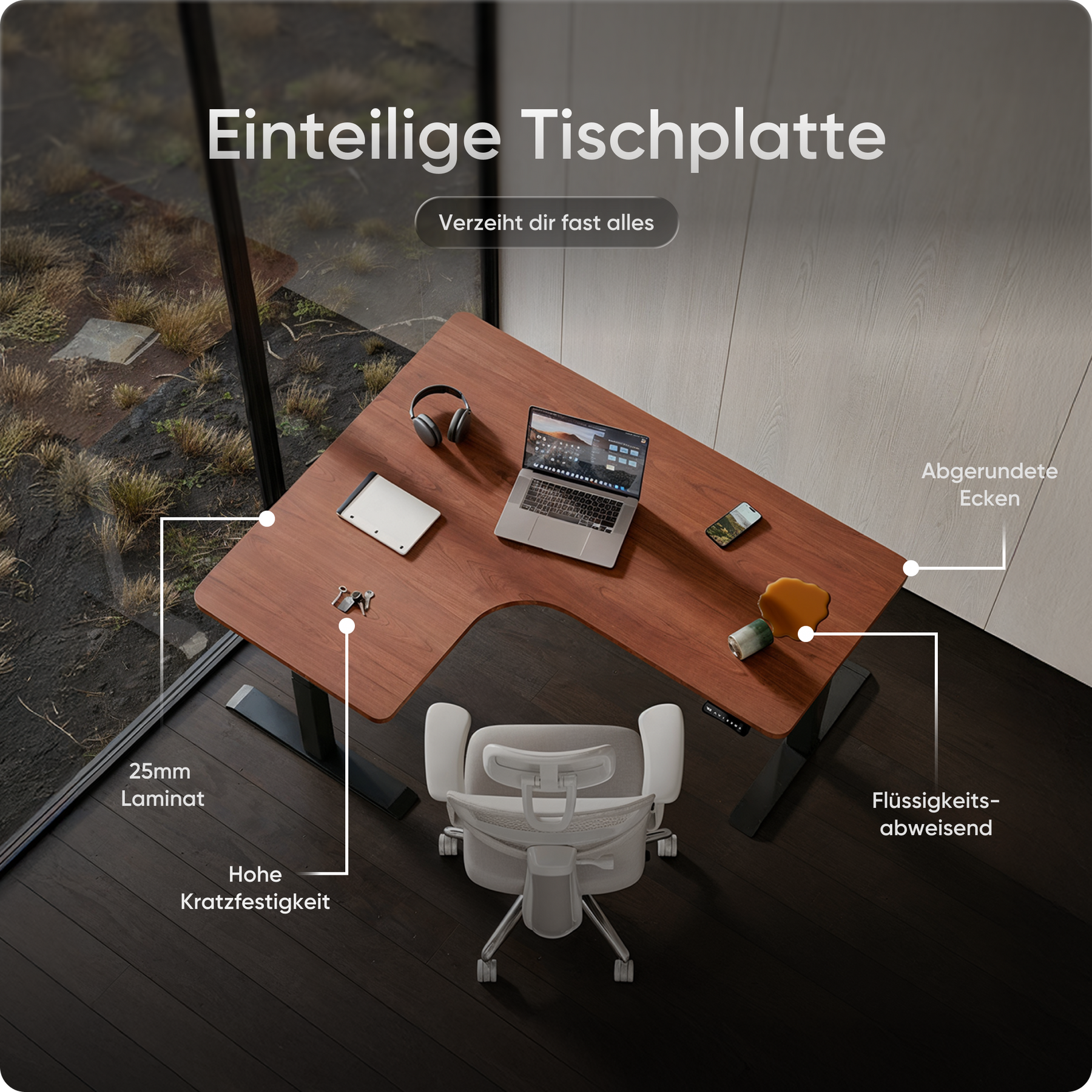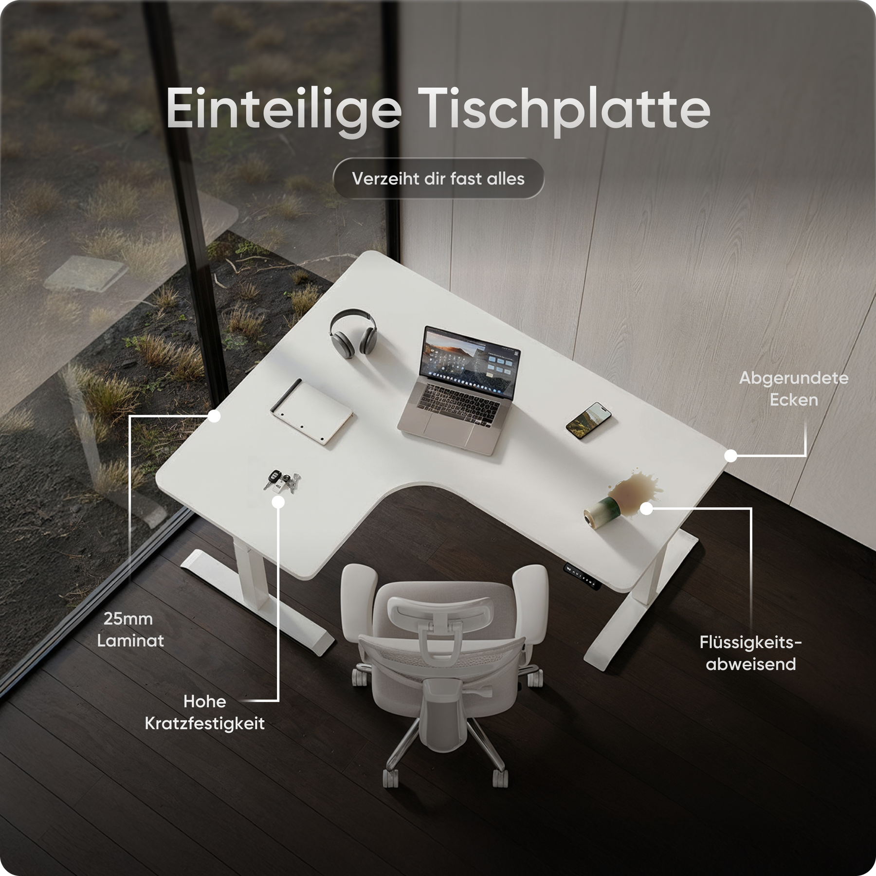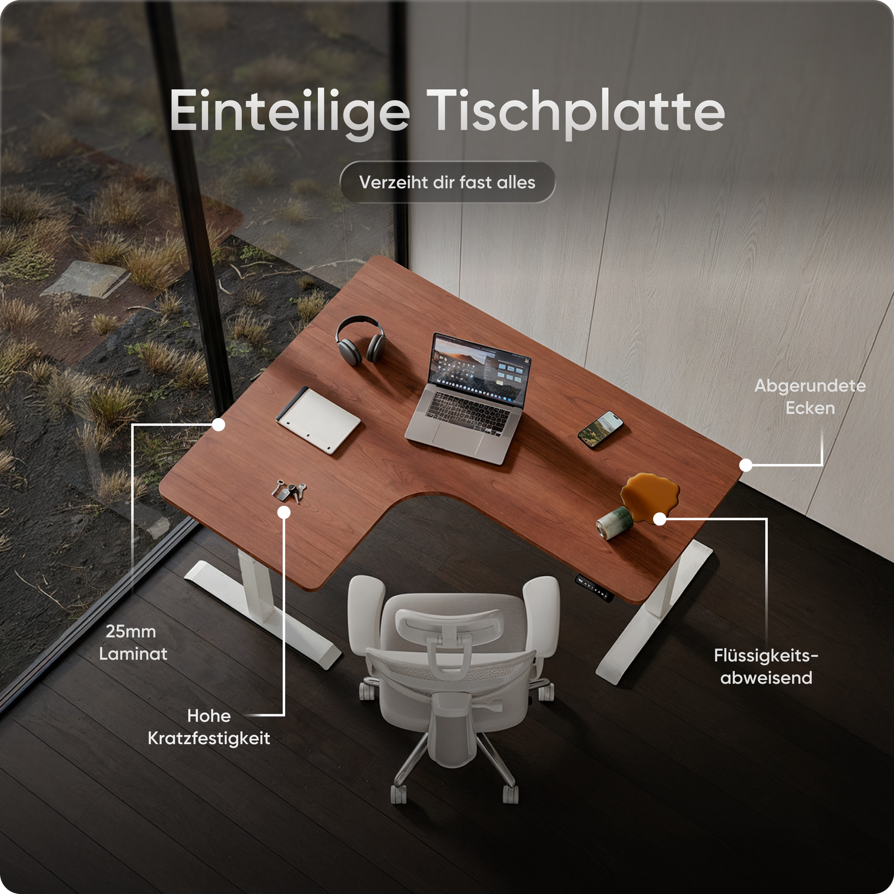 Die Tischplatten bestehen aus emissionsarmen Materialien und sind besonders umweltfreundlich. Ihre kratz- und wasserfeste Oberfläche schützt zuverlässig im Alltag und lässt sich mit einem Wisch mühelos reinigen – ideal für produktives Arbeiten ohne Aufwand.
